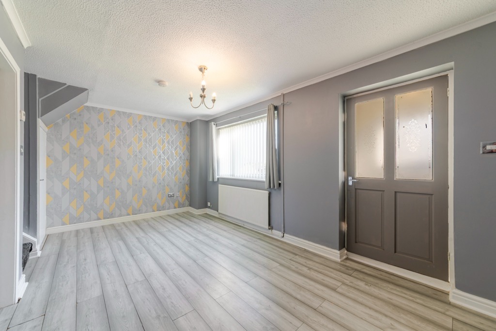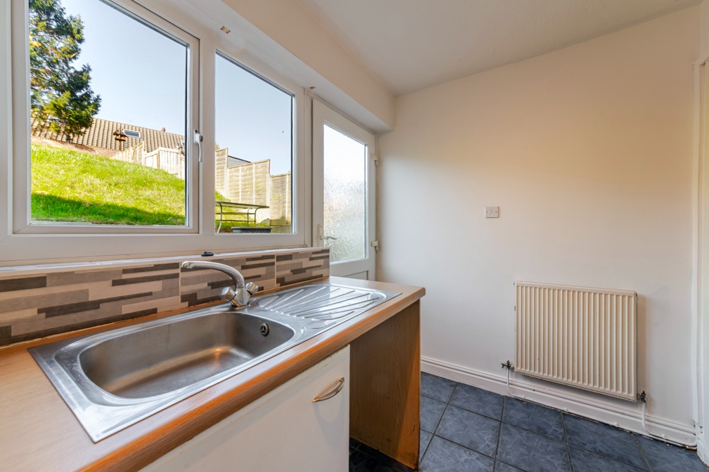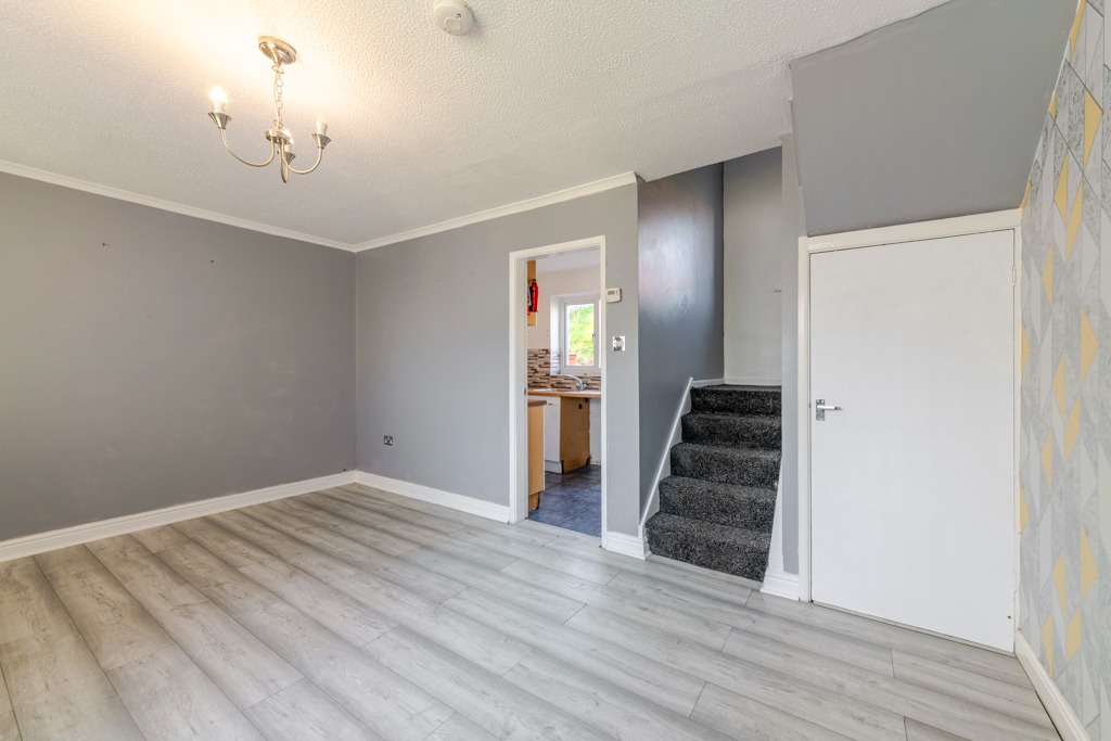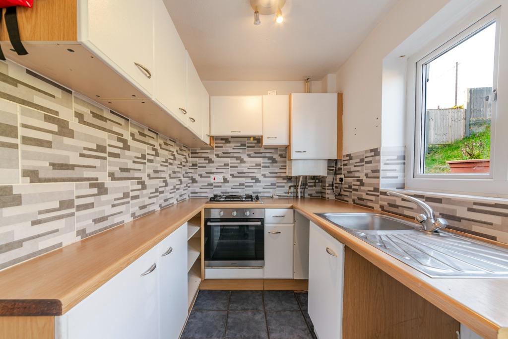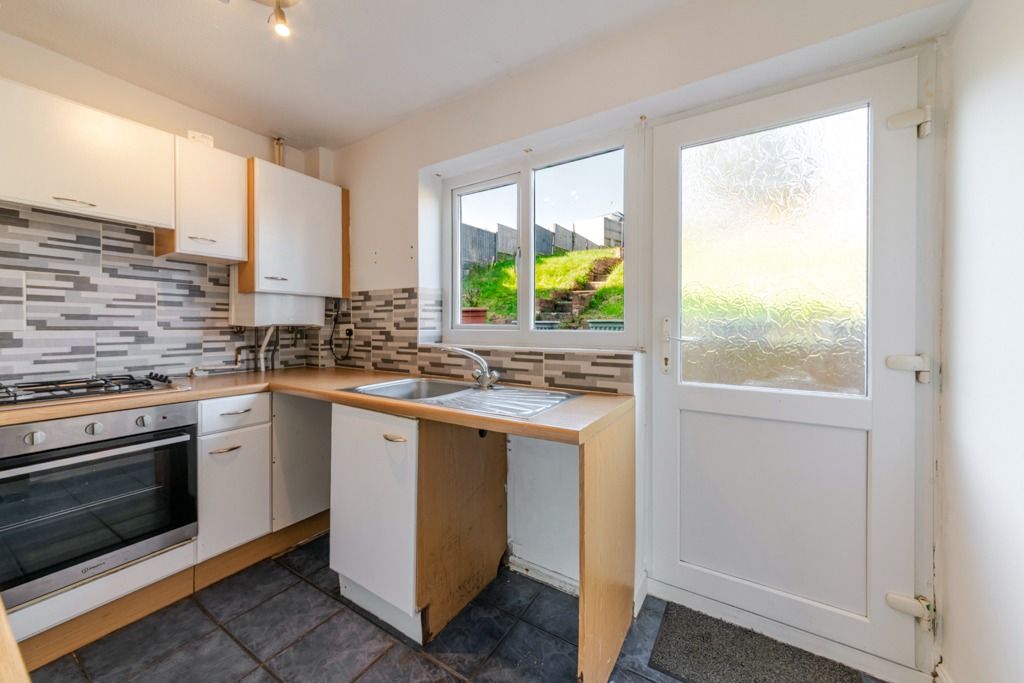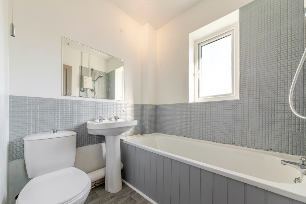 Upon arrival, a welcoming porchway leads into the home. The living room is cosy and offers practical understairs storage. The kitchen, while in need of updating over time, features a rear window overlooking the rear garden. A door opens directly to the garden, allowing for a pleasant connection to the outdoor space. The family bathroom includes a bath with an overhead shower, catering to everyday needs.