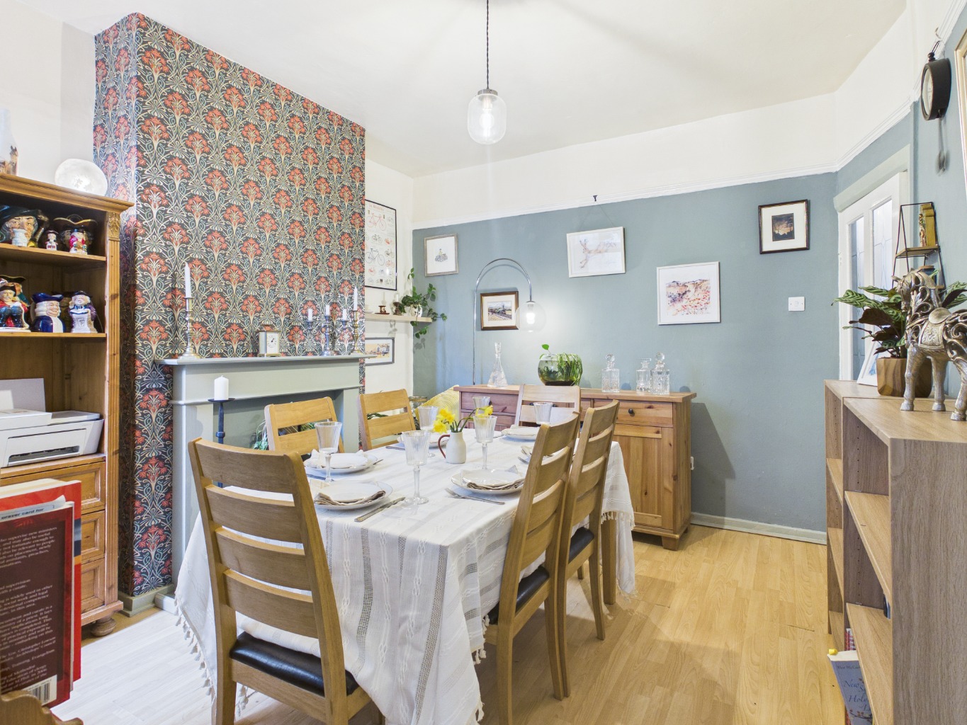 Upon entering, the front reception room immediately impresses with its bay window, high ceilings, and laminate flooring, complemented by an electric fire, creating a welcoming atmosphere. The second reception room, ideal for dining, continues the theme of high ceilings and laminate flooring, also featuring an electric fire, offering versatile spaces for relaxation and entertaining. The kitchen is thoughtfully designed with tiled flooring and a dedicated utility area.