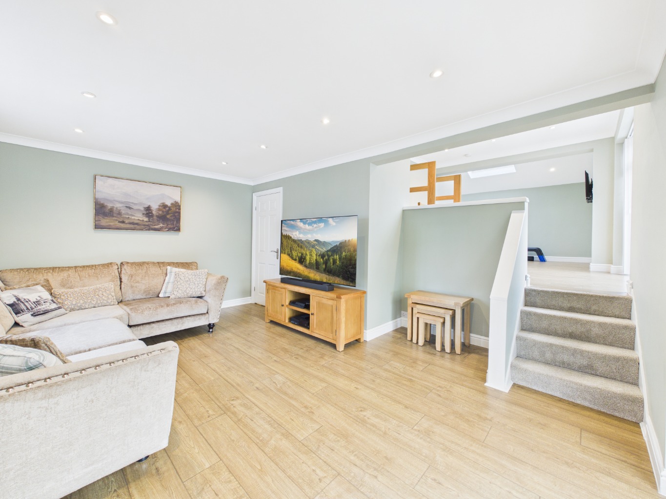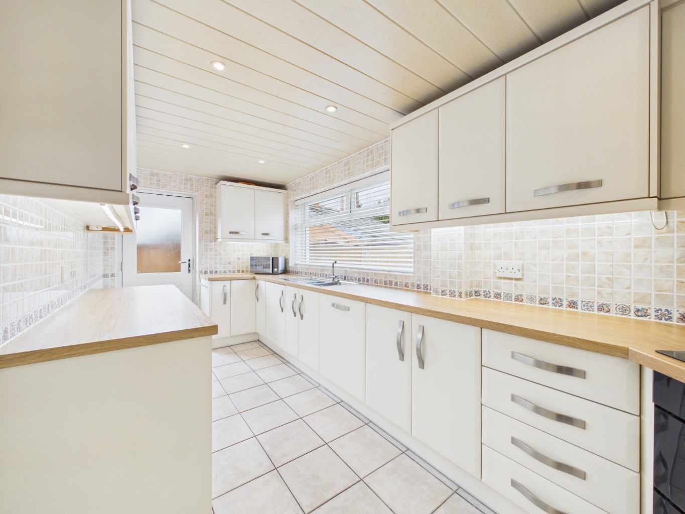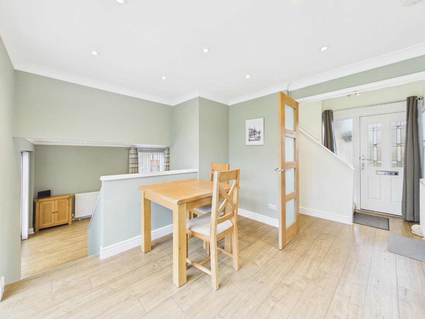 A series of gentle level changes add character and definition to the space, with steps leading down to the main lounge. This inviting area offers a comfortable setting for everyday living and provides direct access to the spacious kitchen. Well-appointed, the kitchen features ample cupboard and worktop space, integrated appliances, an induction hob, and clever storage solutions, along with a convenient rear access door.
