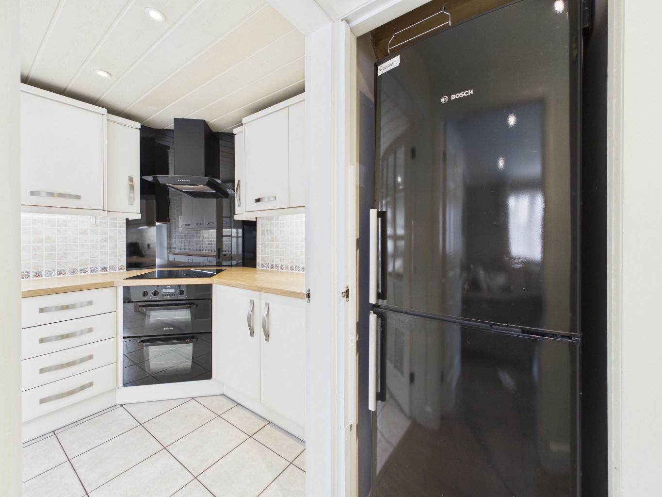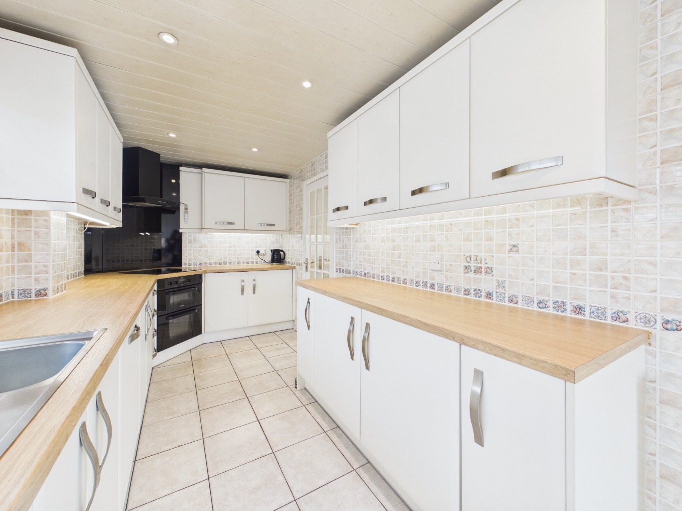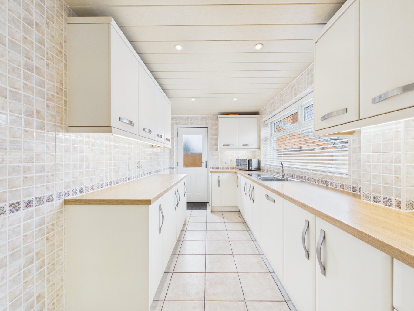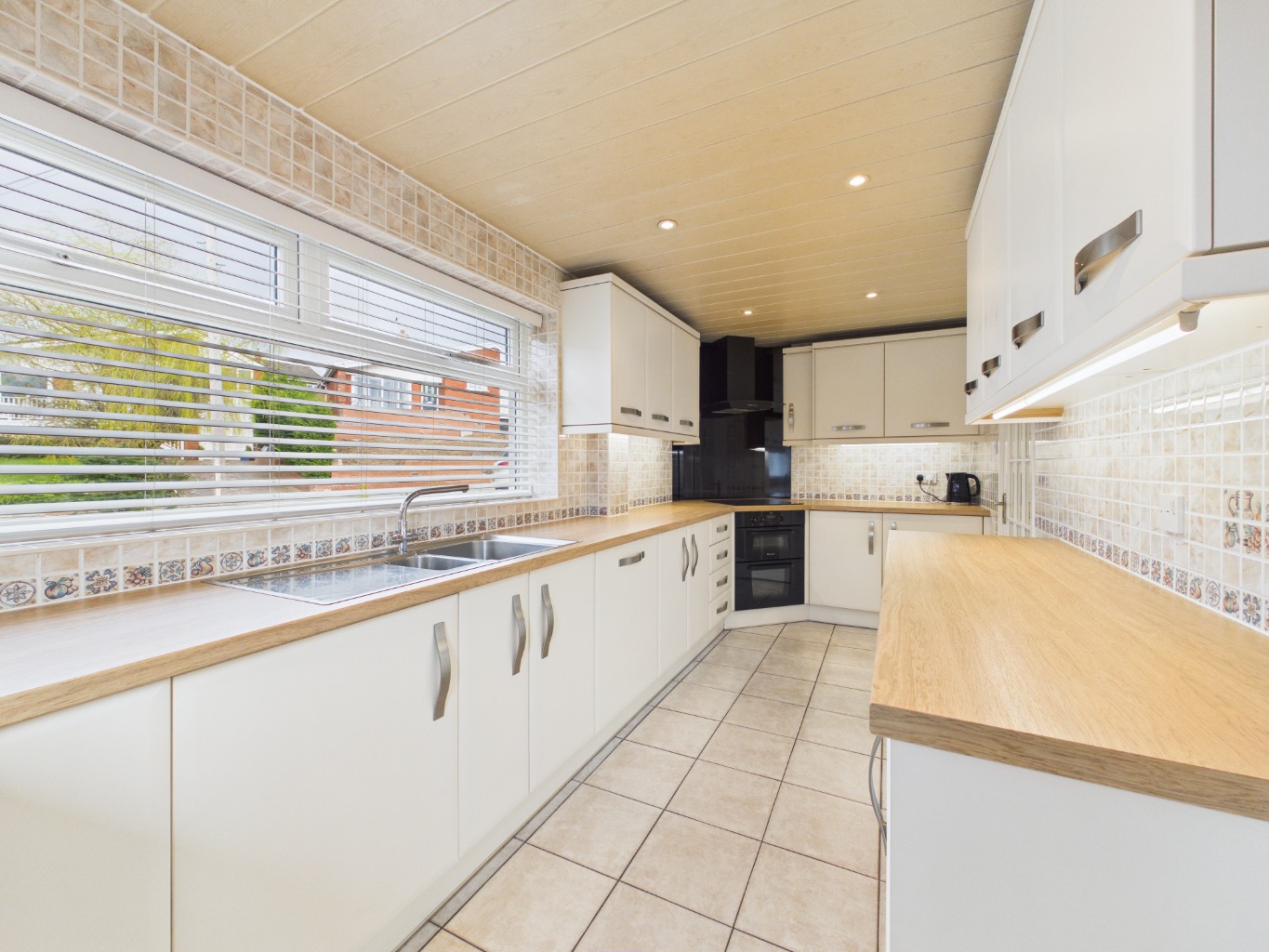 A series of gentle level changes add character and definition to the space, with steps leading down to the main lounge. This inviting area offers a comfortable setting for everyday living and provides direct access to the spacious kitchen. Well-appointed, the kitchen features ample cupboard and worktop space, integrated appliances, an induction hob, and clever storage solutions, along with a convenient rear access door.