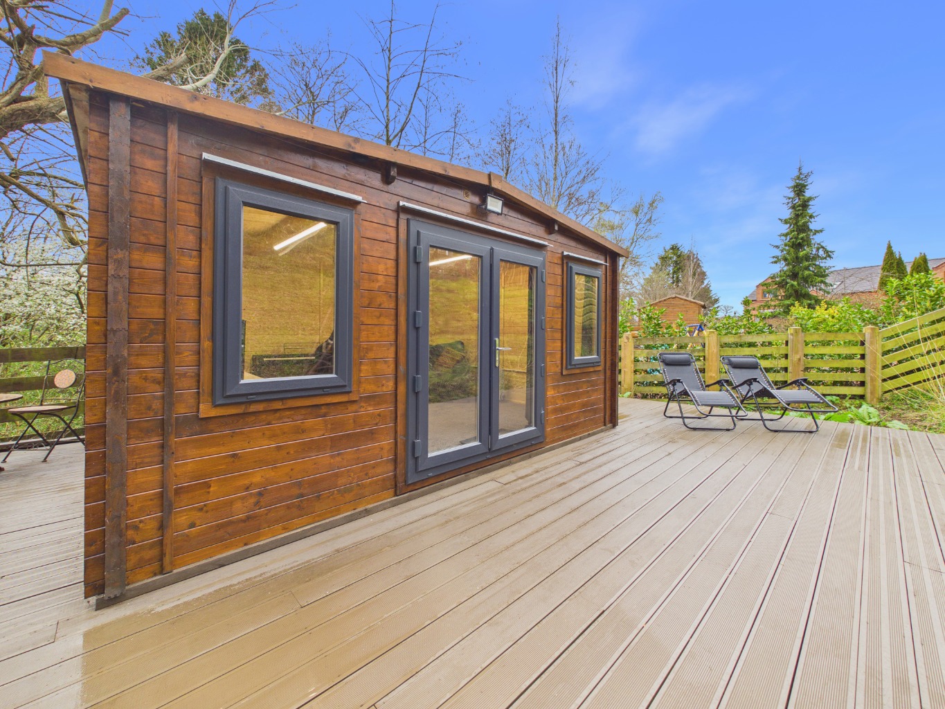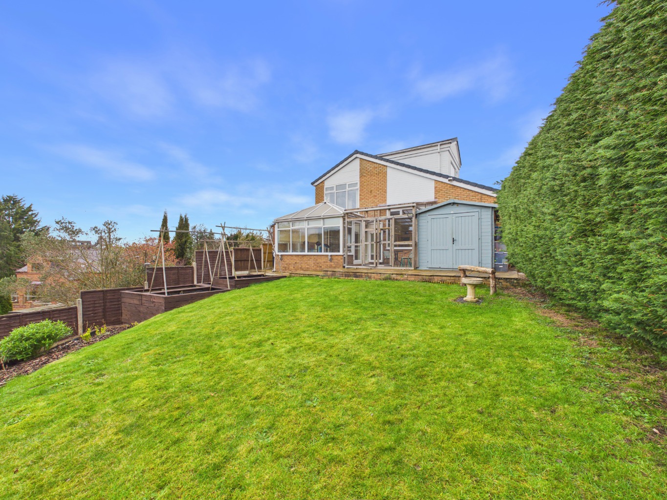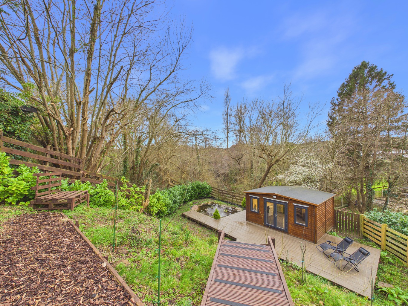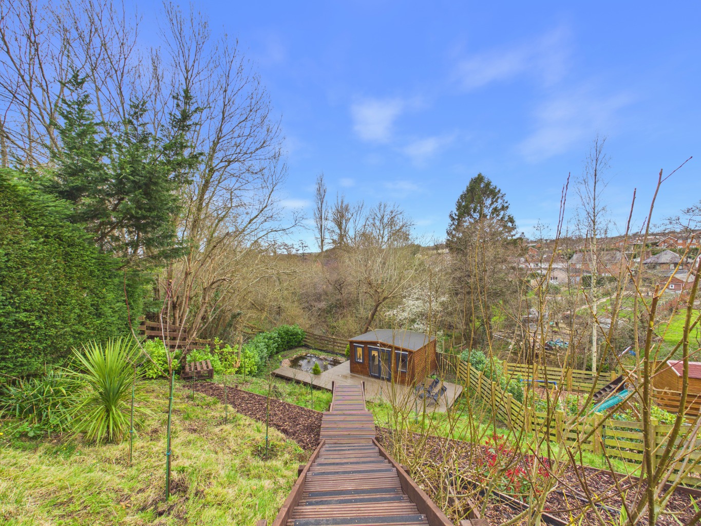 The rear garden is a true highlight, thoughtfully arranged over several tiers to create a variety of usable spaces. Beginning with the sheltered patio, the garden opens out to raised bedding areas and a well-maintained lawn. A staircase leads down to a pond and generous decked area, perfect for hosting or unwinding. At the foot of the garden, a versatile lodge with electrics and internet access provides an ideal space for a home office, studio, or retreat. To the front, the property benefits from a spacious driveway offering parking for multiple vehicles.