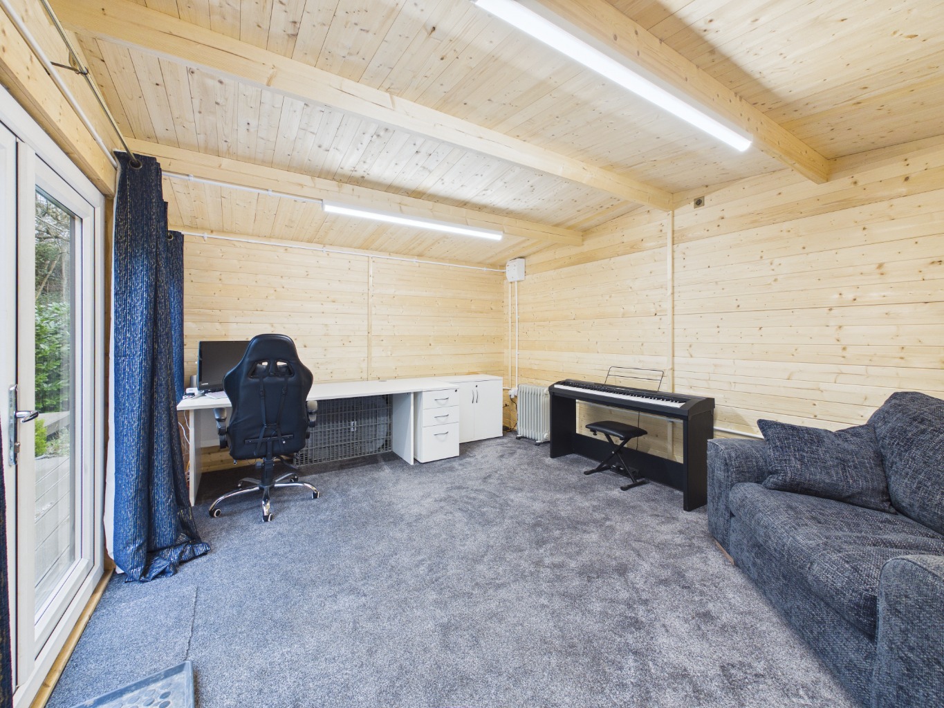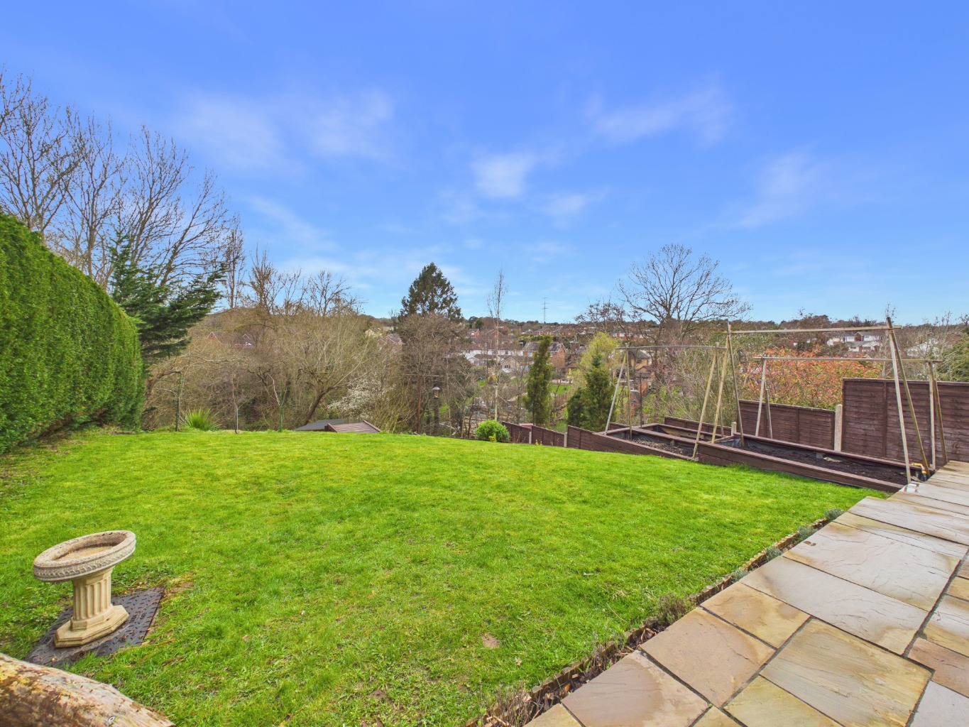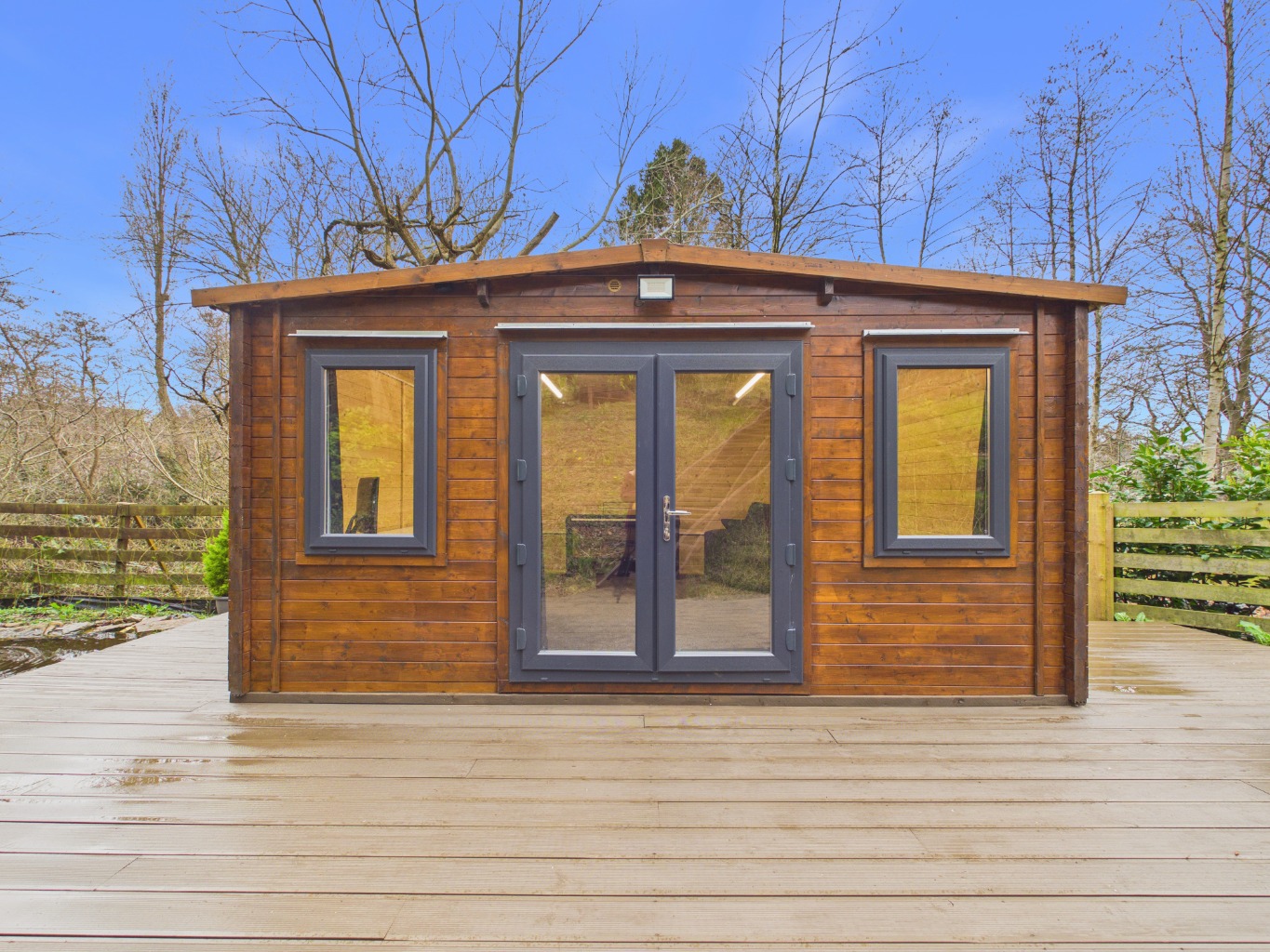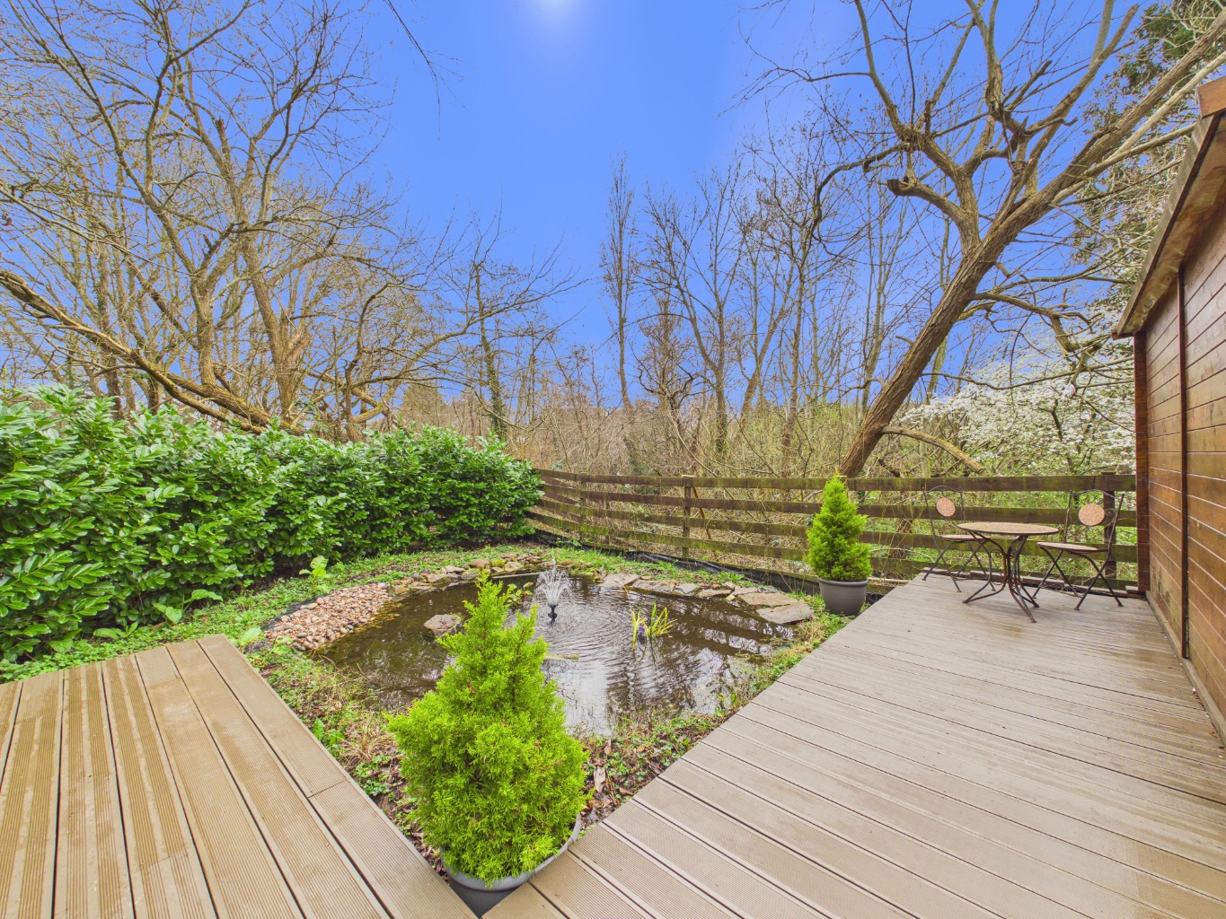 The rear garden is a true highlight, thoughtfully arranged over several tiers to create a variety of usable spaces. Beginning with the sheltered patio, the garden opens out to raised bedding areas and a well-maintained lawn. A staircase leads down to a pond and generous decked area, perfect for hosting or unwinding. At the foot of the garden, a versatile lodge with electrics and internet access provides an ideal space for a home office, studio, or retreat. To the front, the property benefits from a spacious driveway offering parking for multiple vehicles.
