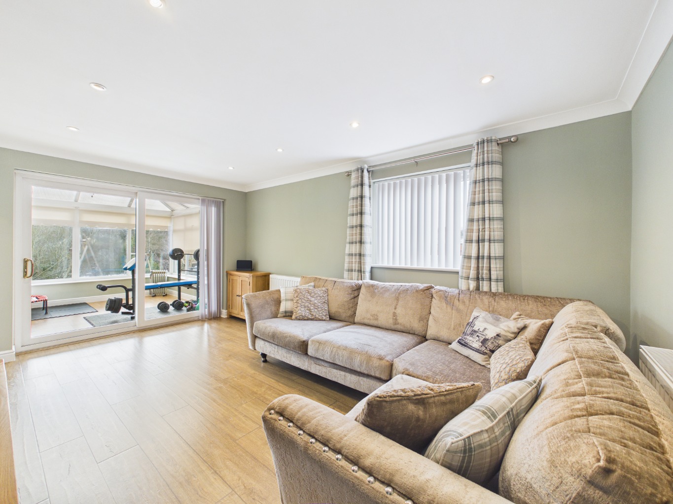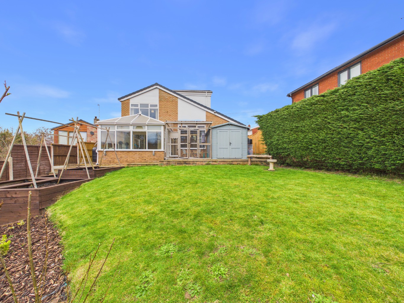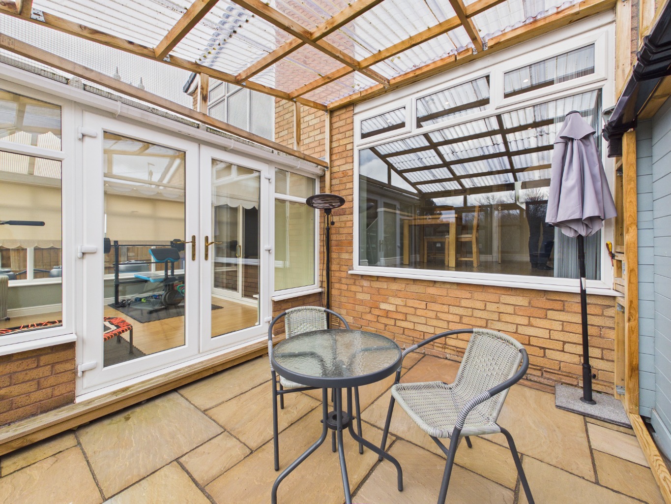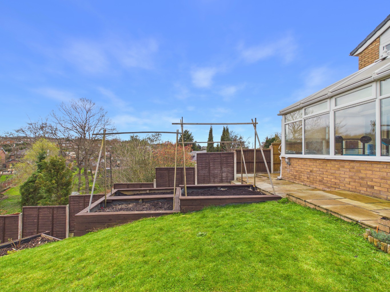 From the lounge, the home extends into a bright conservatory, forming the third reception room. This space enjoys a seamless connection to the outdoors, opening onto a sheltered patio area—ideal for relaxing or entertaining in all seasons.