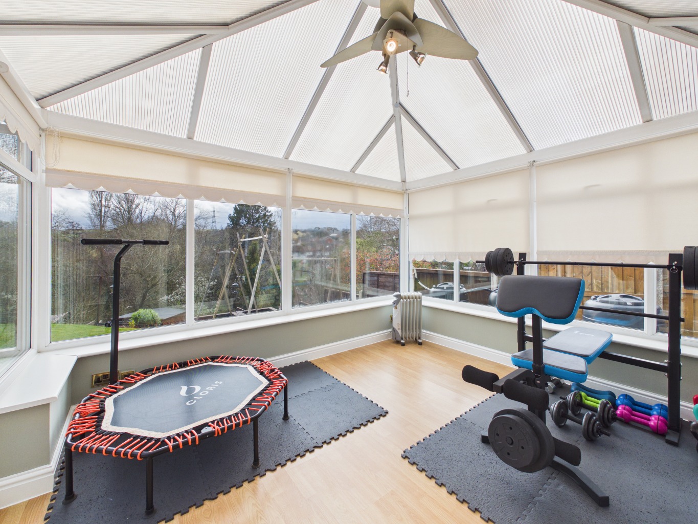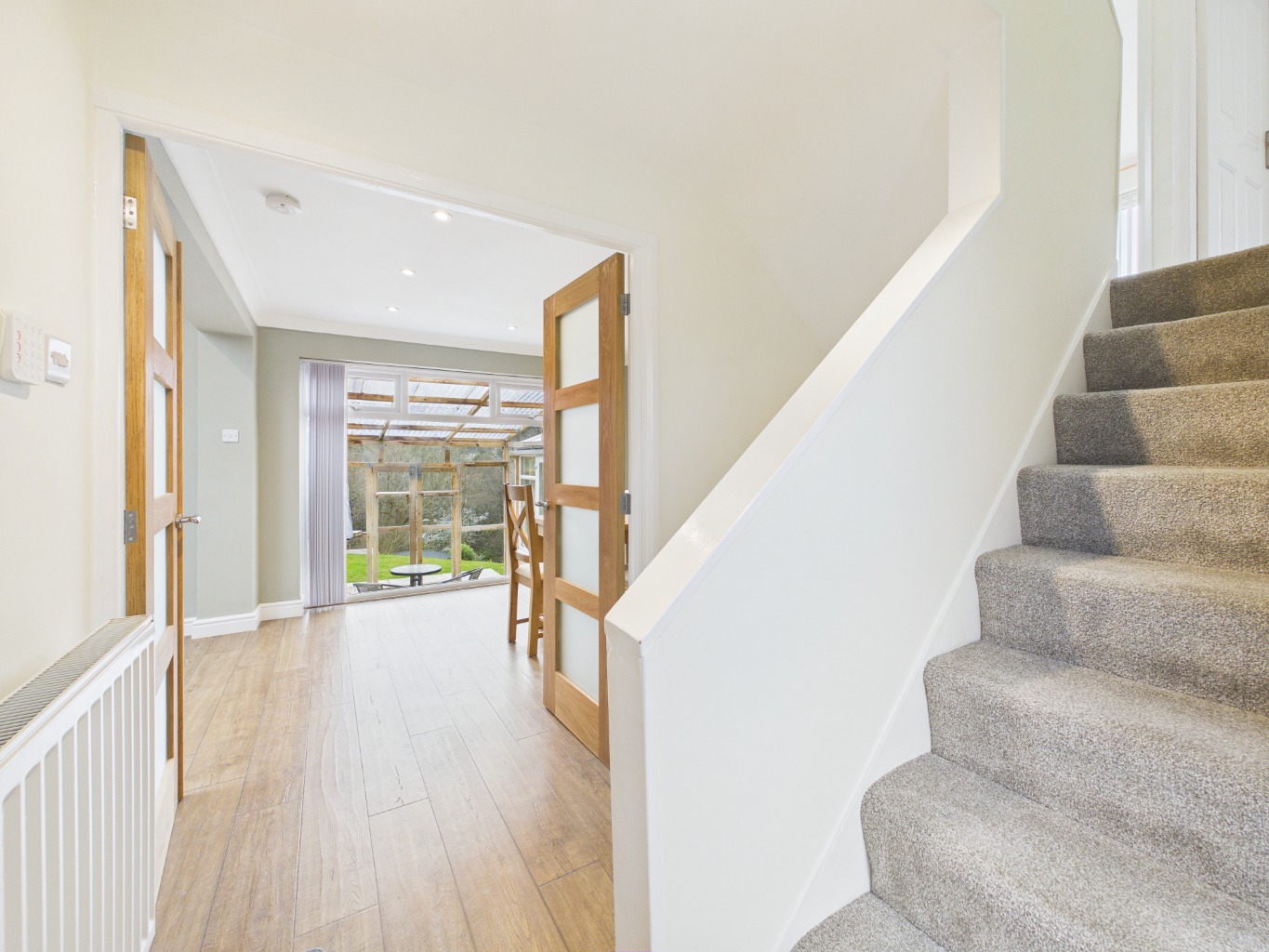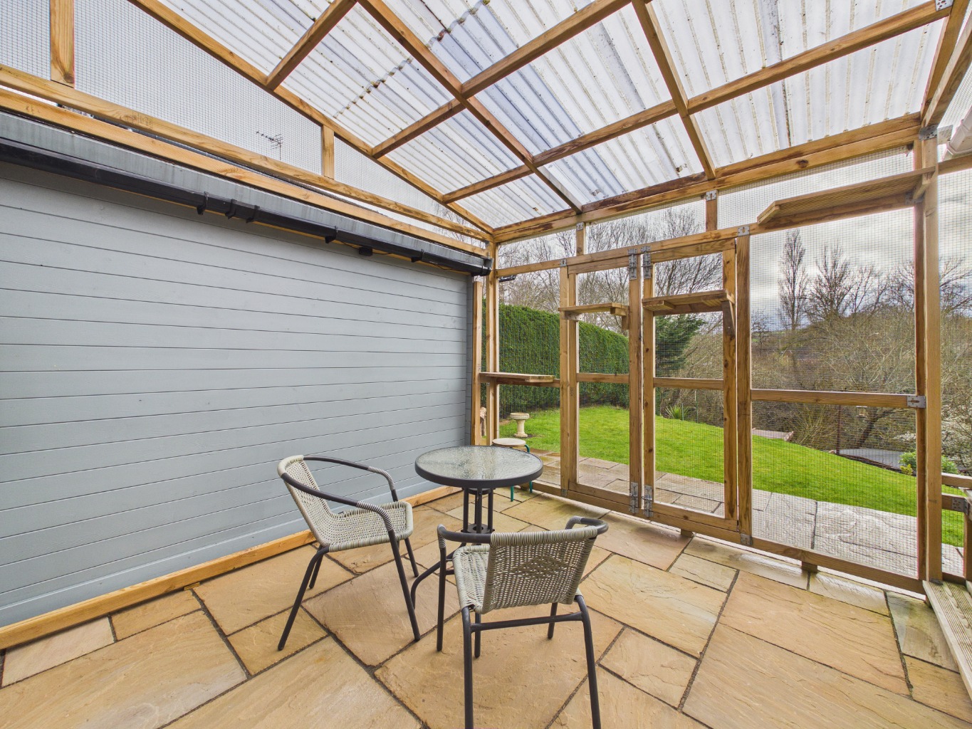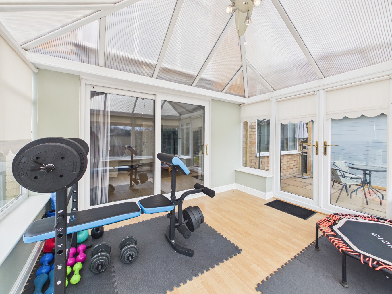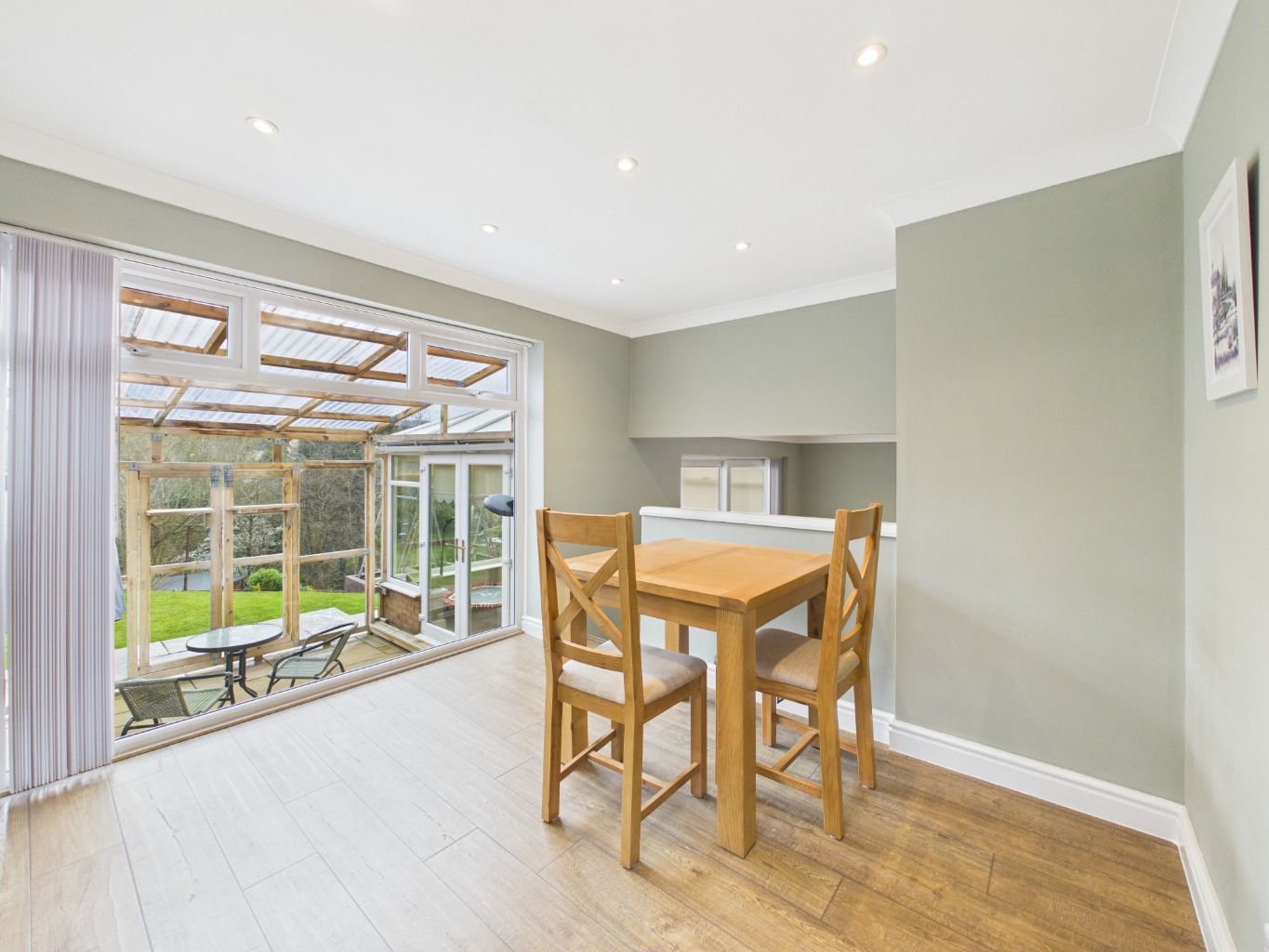 From the lounge, the home extends into a bright conservatory, forming the third reception room. This space enjoys a seamless connection to the outdoors, opening onto a sheltered patio area—ideal for relaxing or entertaining in all seasons.