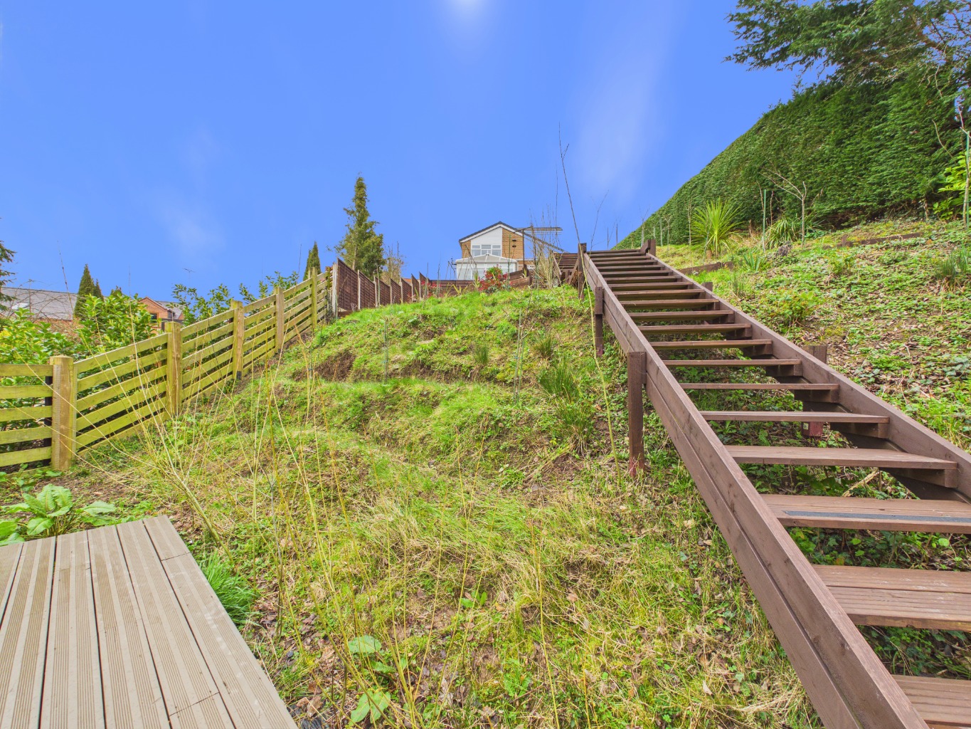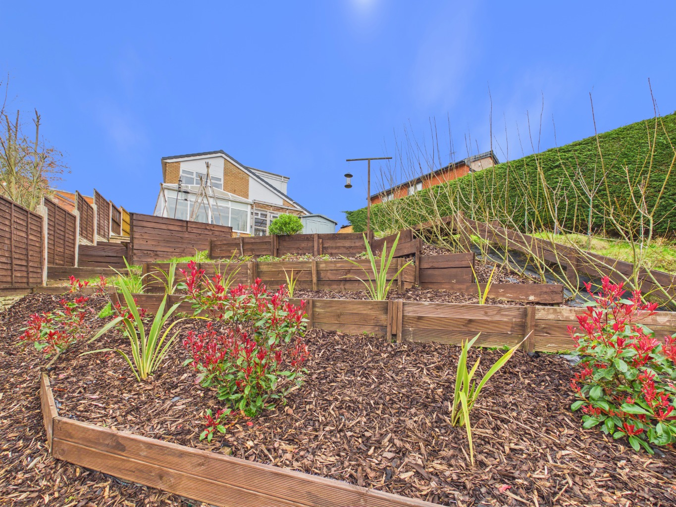 New roof, converted the garage, built steps to bottom of the garden, added decking and a large garden room. Built 4 veg beds and planted fruit trees, added a shed and a pond