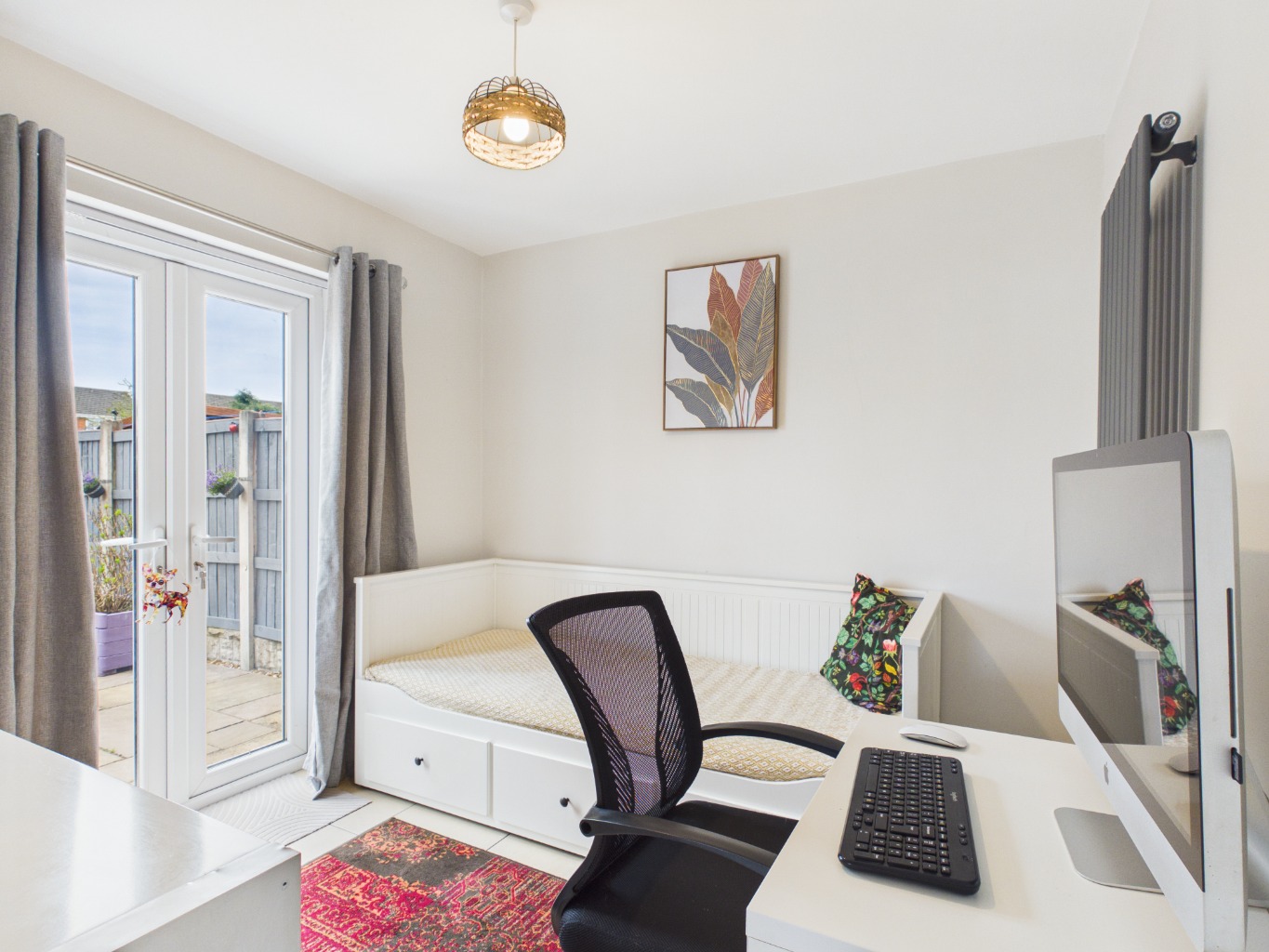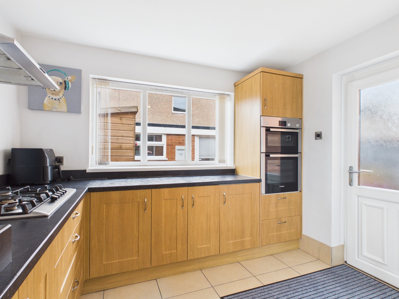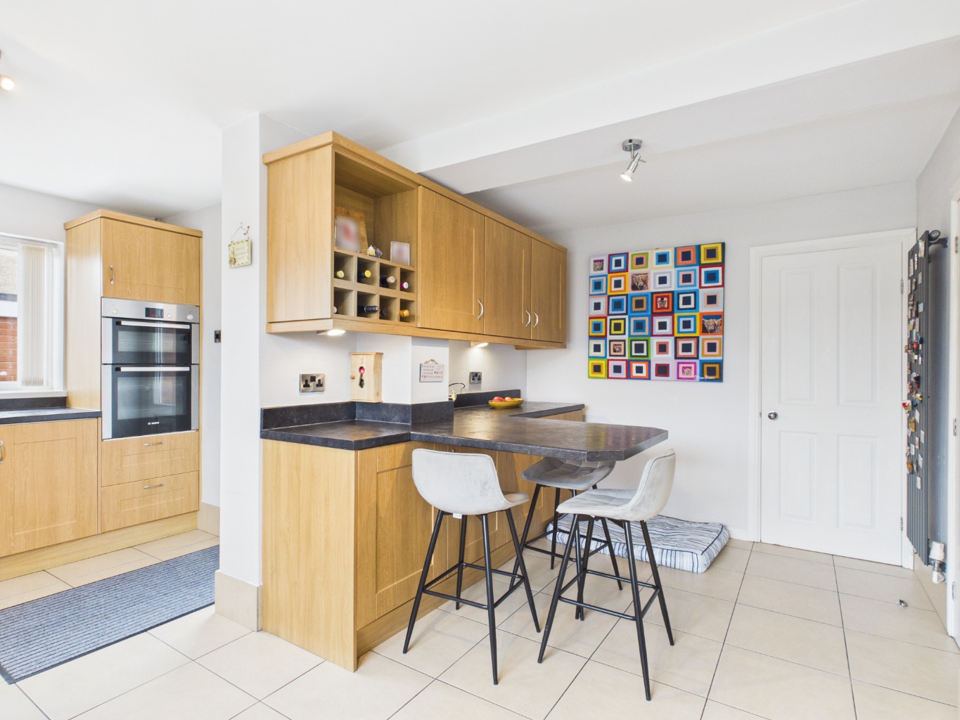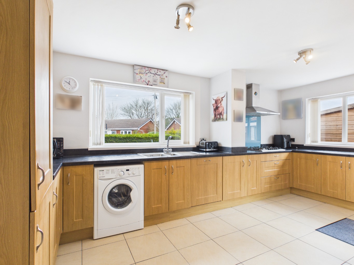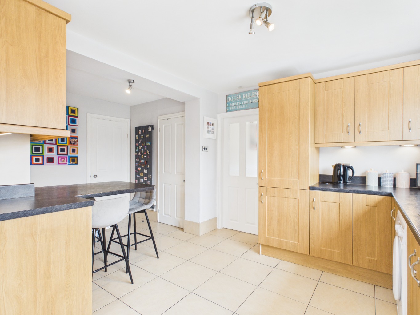 The kitchen itself is a standout feature of the home — generously sized and well-appointed with ample cupboard and countertop space, integrated appliances, and an eye-level oven. A practical breakfast bar enhances everyday living, while large windows allow for plenty of natural light. From here, access leads to an additional ground floor room, offering flexibility as a study, home office, or guest space, with doors opening out to the garden. The former garage has been cleverly adapted further enhancing the home’s versatility.