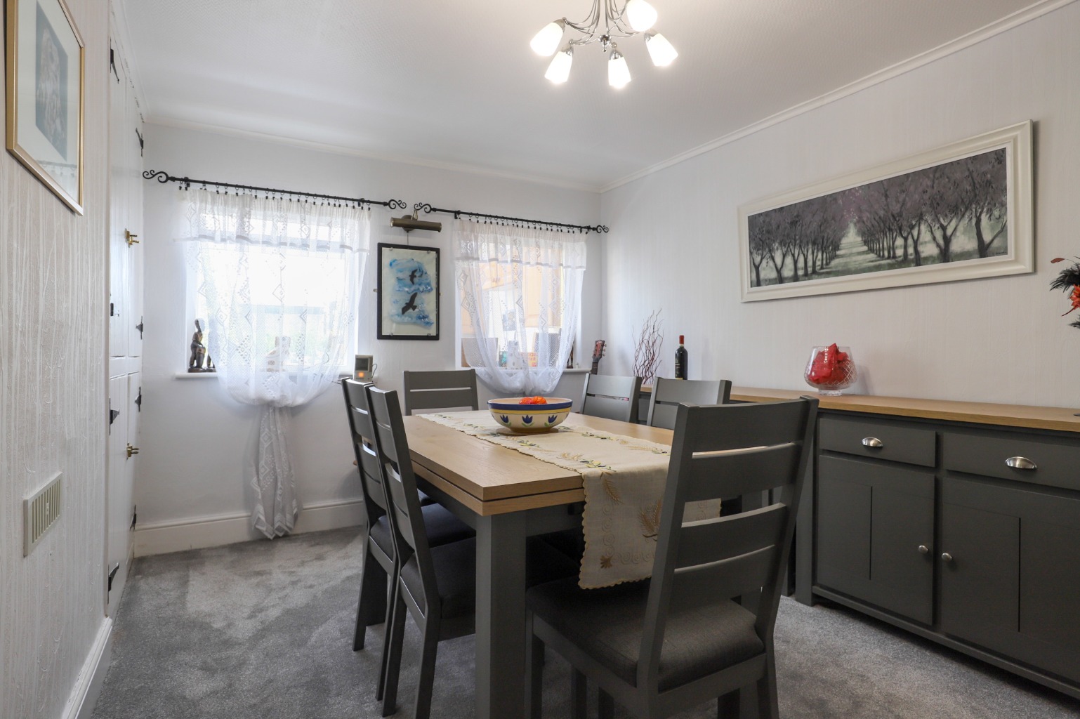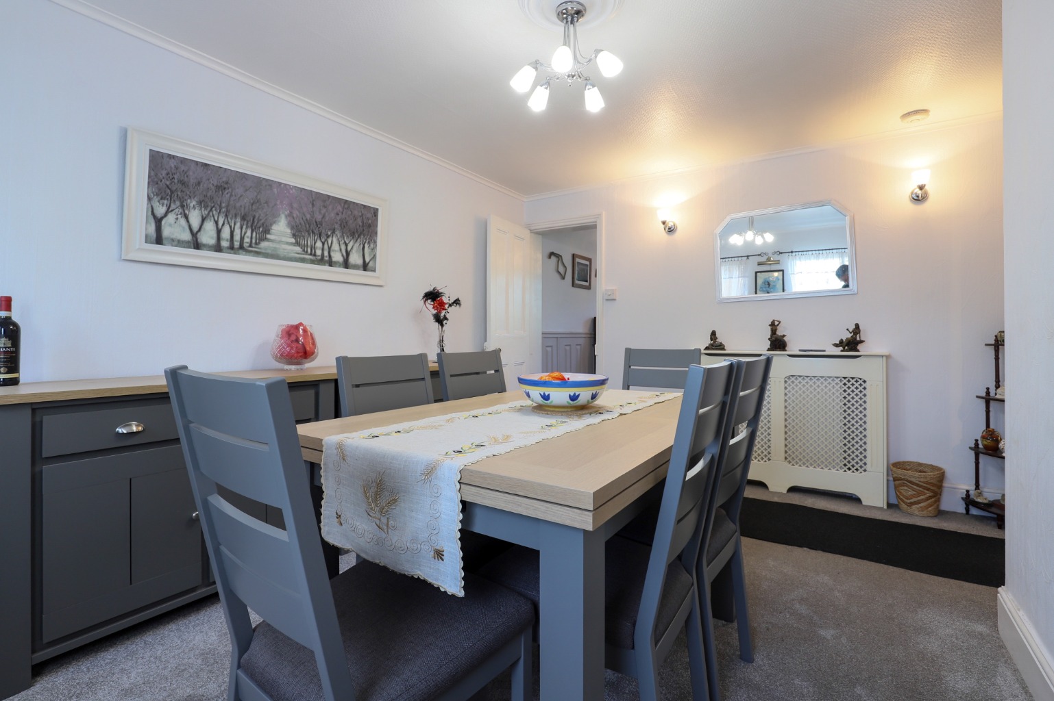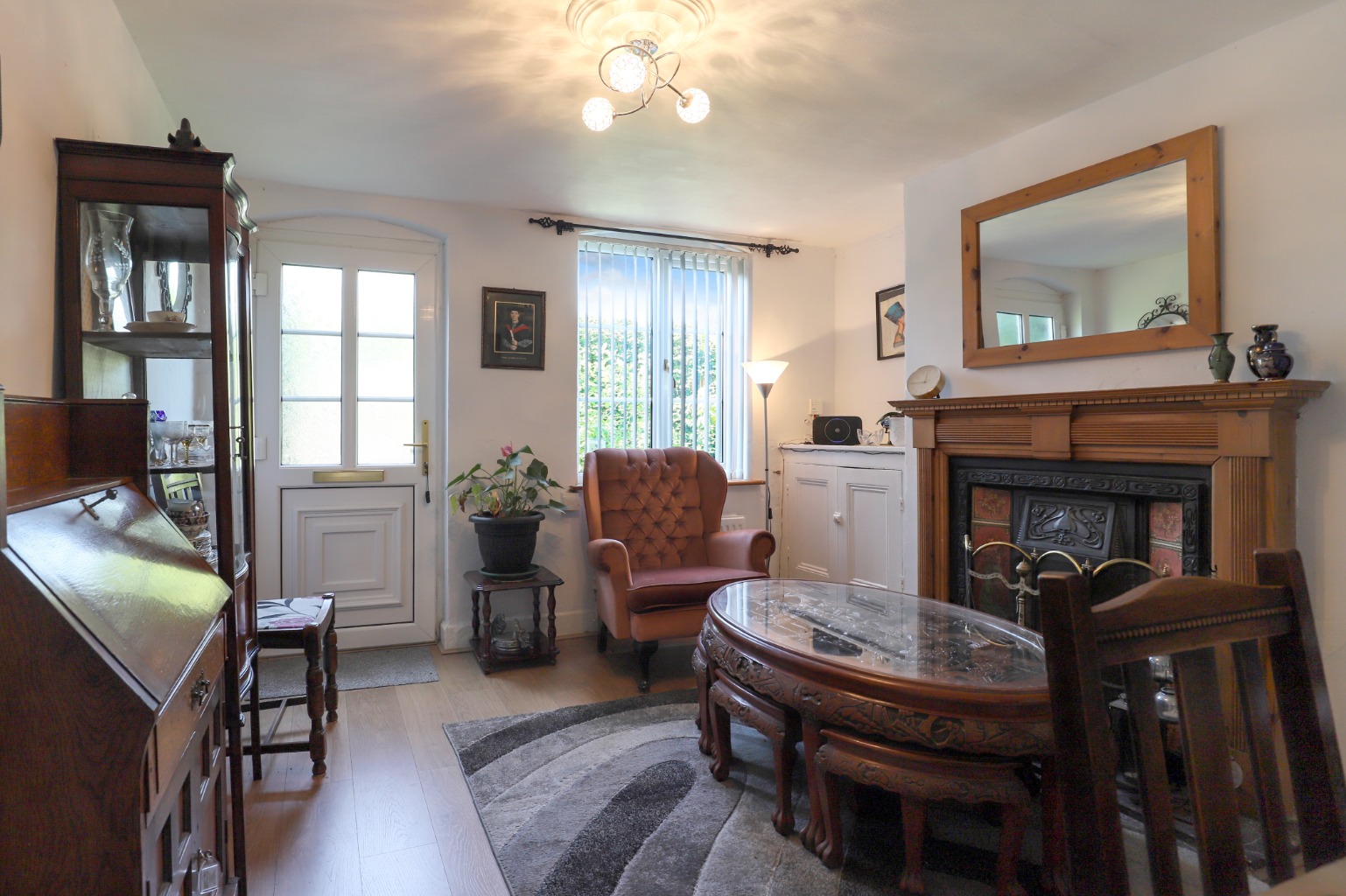 You enter directly into a spacious second reception room, featuring a stunning fireplace and filled with natural warmth and charm. This room leads into the dedicated dining room, offering a comfortable space for family meals or entertaining.