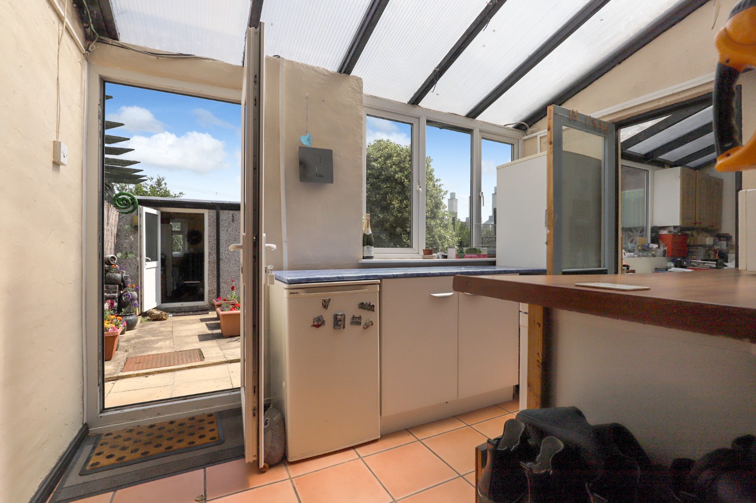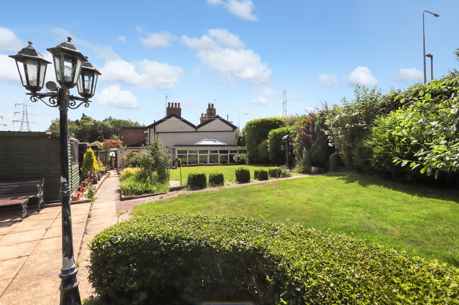 Outside, the property really comes into its own. The expansive rear garden features seating areas for al fresco dining, well-maintained lawns, mature shrubs, and ample space for outdoor activities or potential development. The current owners have installed aviaries, underlining just how much outdoor space is on offer. Across from the main house is a self-contained outbuilding currently used as a home office—ideal as a studio, workspace, or craft room.
