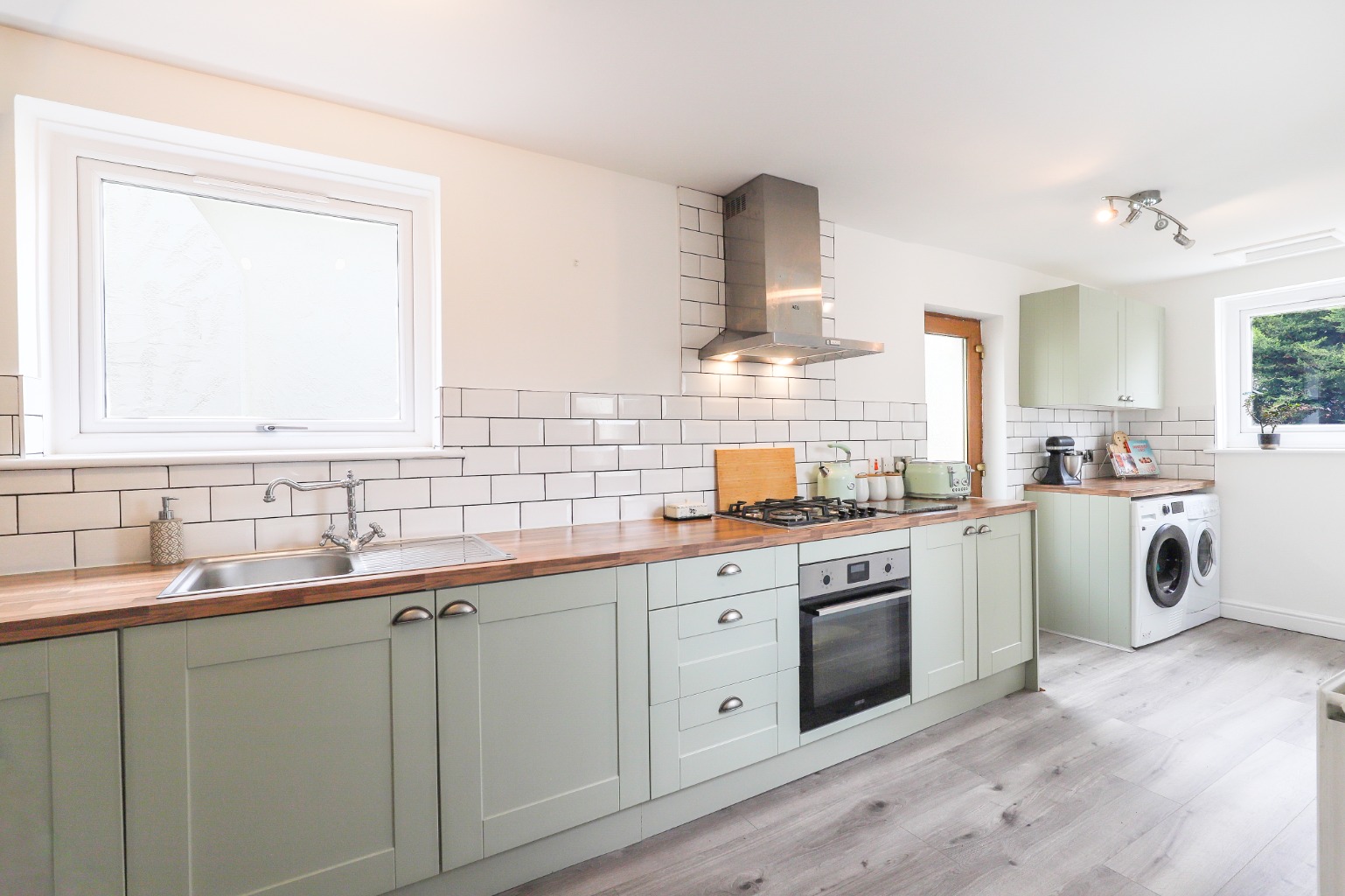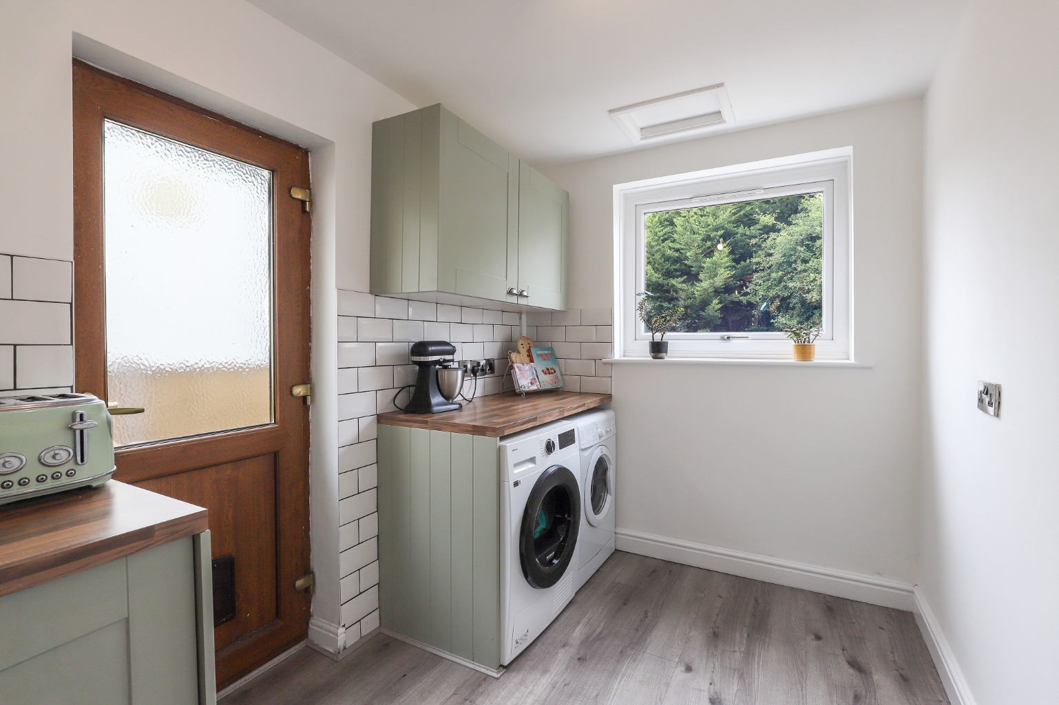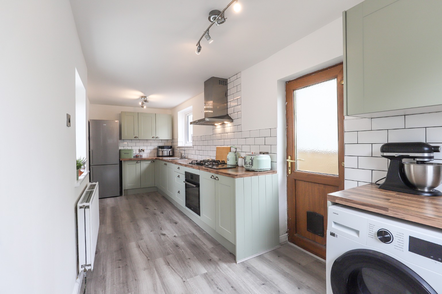 Designed with both aesthetics and functionality in mind, the contemporary kitchen provides a stylish and practical space for culinary pursuits, also featuring a door leading to the rear garden.