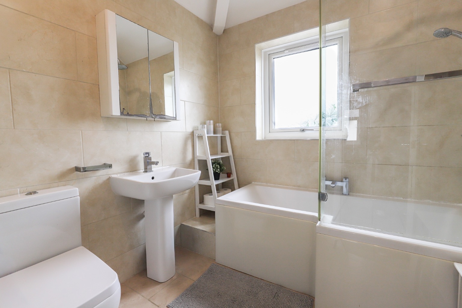 The family bathroom is tastefully appointed and features a P-shaped bath with an overhead shower.