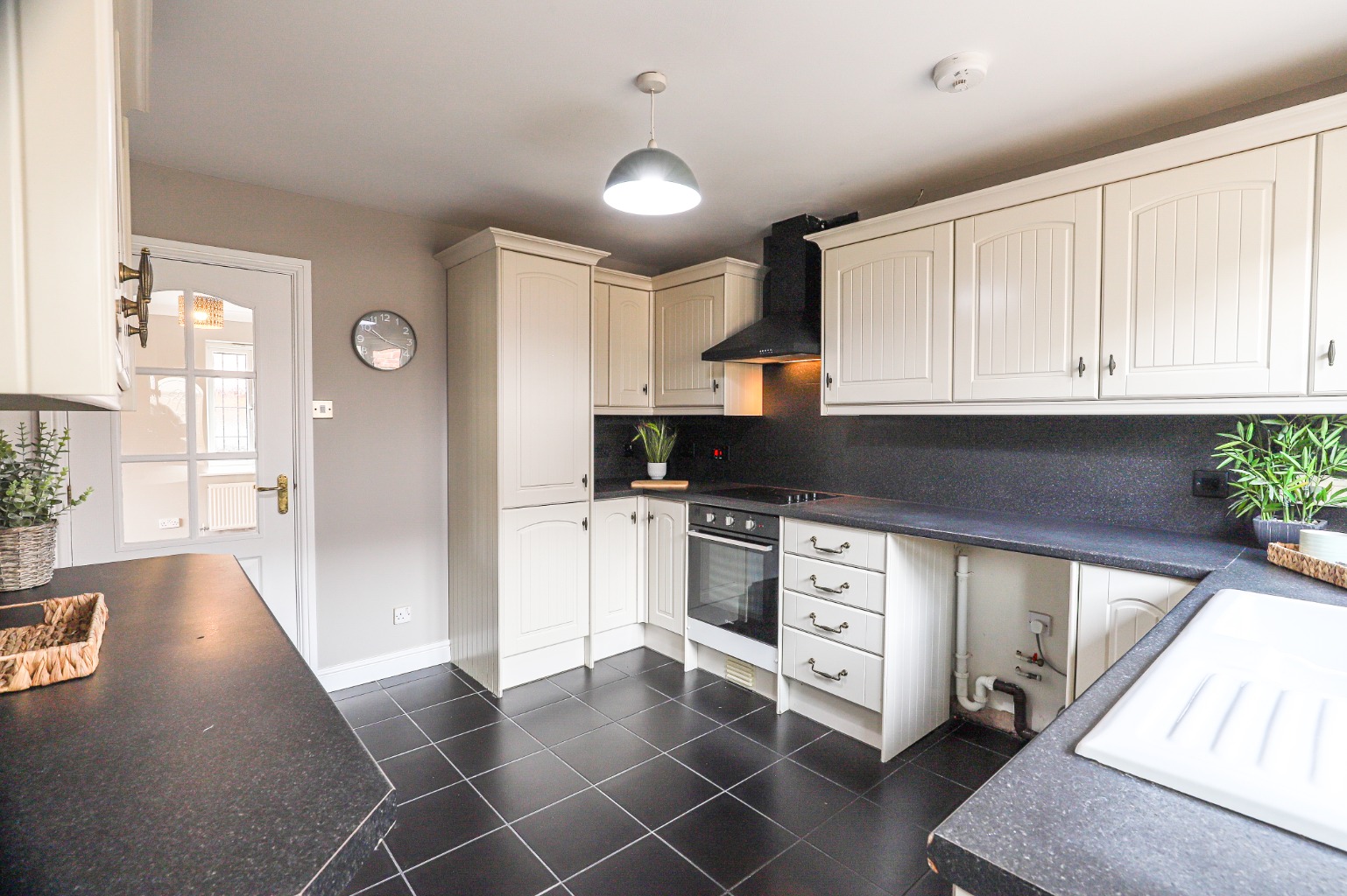 Just off the lounge is the modern kitchen, both stylish and highly functional, offering generous storage and worktop space. Thoughtfully designed, it features sleek cabinetry and ample room for culinary preparation, making it perfectly suited to busy family life.