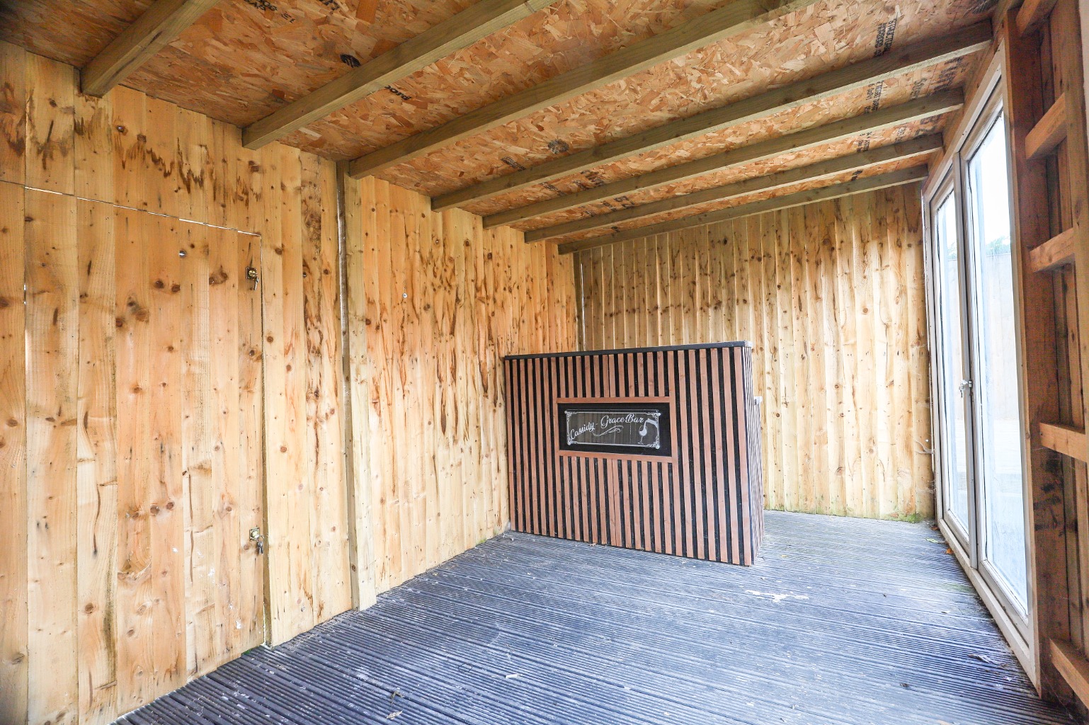 Externally, the rear garden is a private oasis, designed for both relaxation and recreation. It features a charming decking area, perfect for al fresco dining and summer barbecues, alongside a well-maintained lawn. A useful outhouse, currently being transformed into a bar area, also includes a rear door opening onto a private walkway with direct access to the Llwyni Nature Reserve – an incredible benefit for nature lovers, offering scenic walks, local wildlife, and peaceful surroundings right on your doorstep.