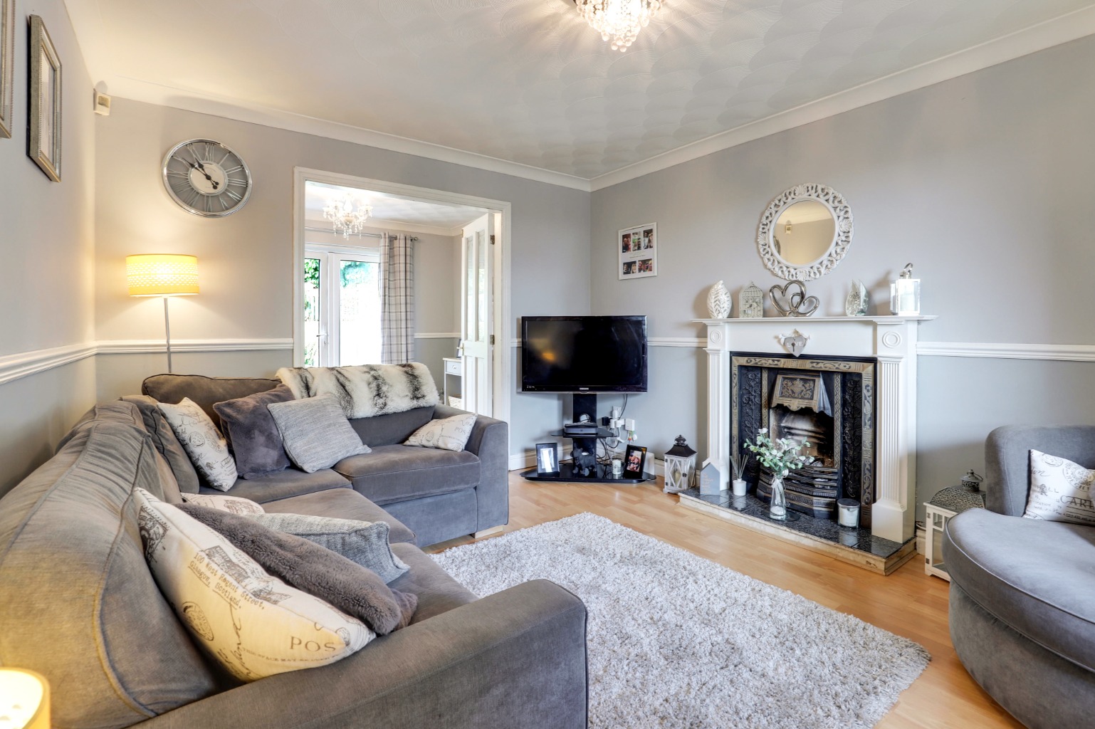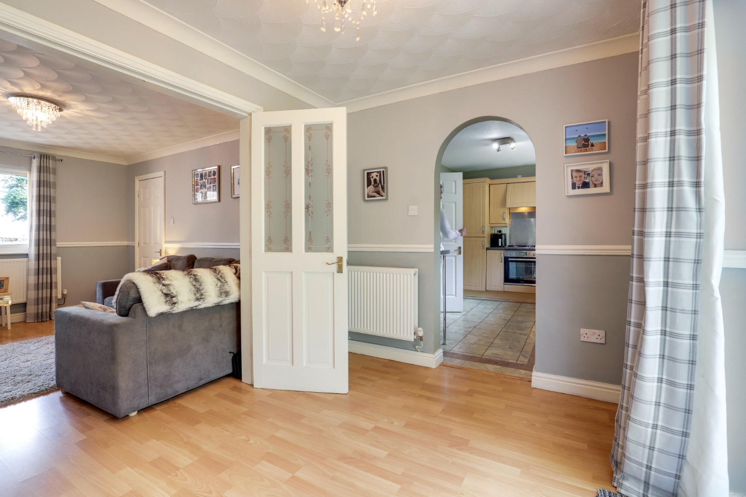 Step through the welcoming entrance hall into a neat and neutral living room, complete with a gas fireplace and oak flooring, which flows seamlessly into the adjoining dining area, where patio doors lead out to the rear garden—perfect for entertaining or relaxed family meals.