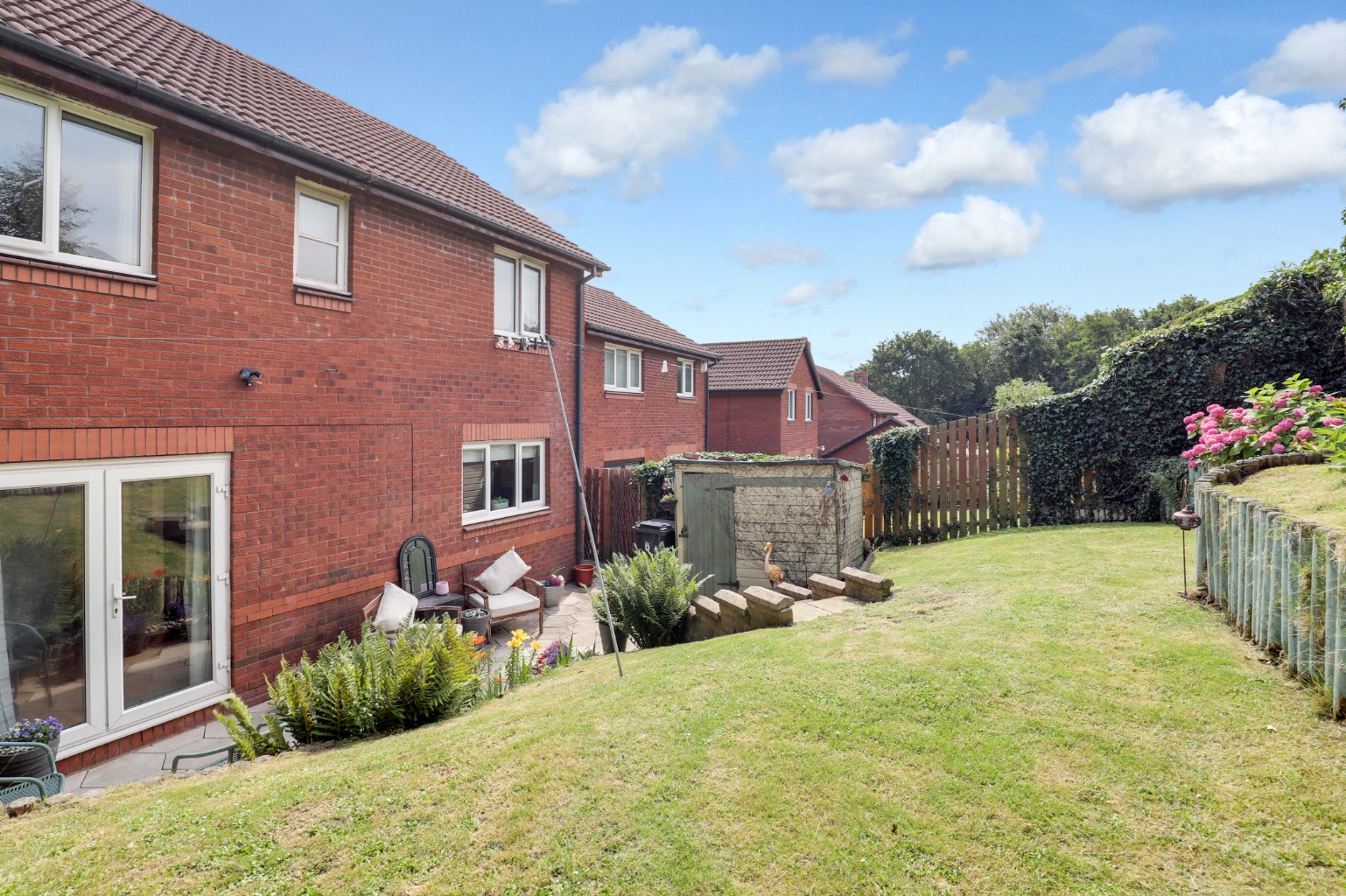 Outside, the tiered rear garden features a patio area with hexagon paving and a raised lawn—perfect for children, pets, or those who enjoy gardening. There is off-road parking on a private driveway for 2–3 vehicles.