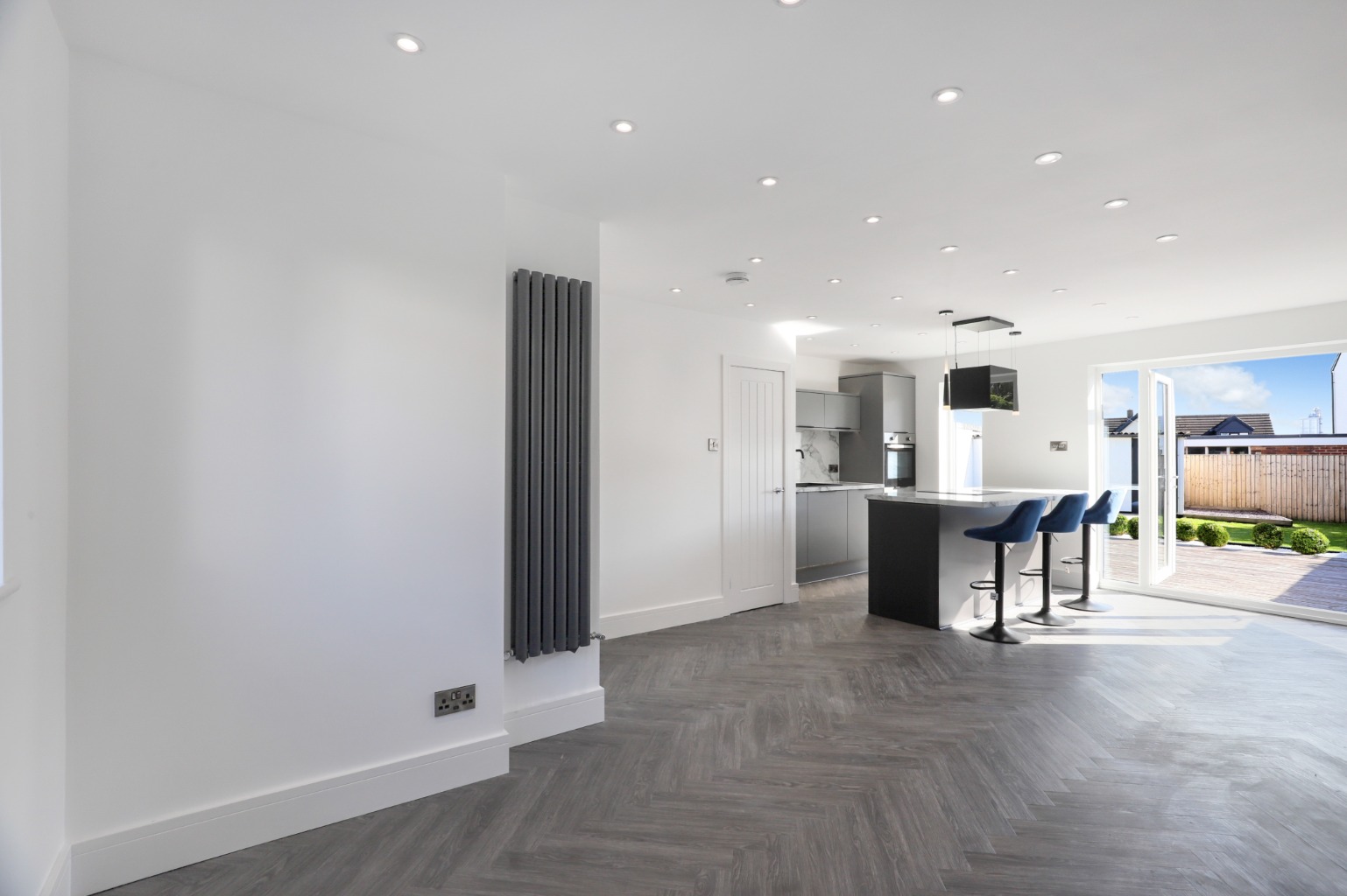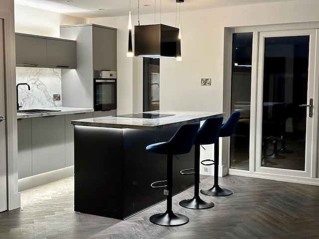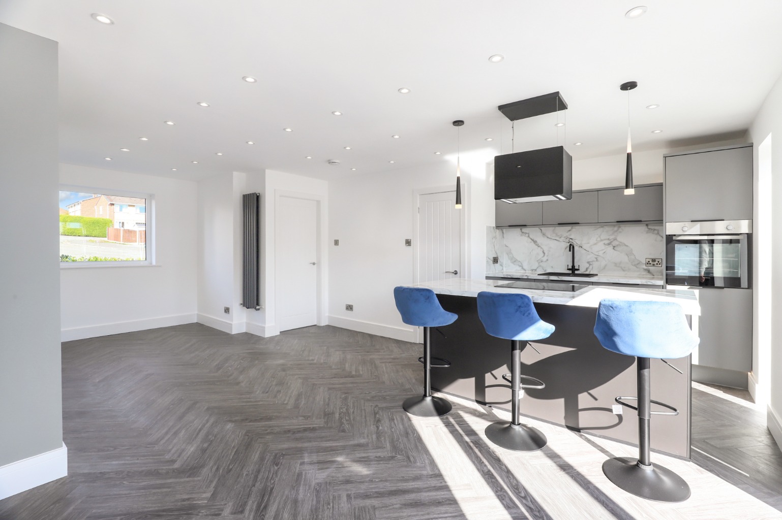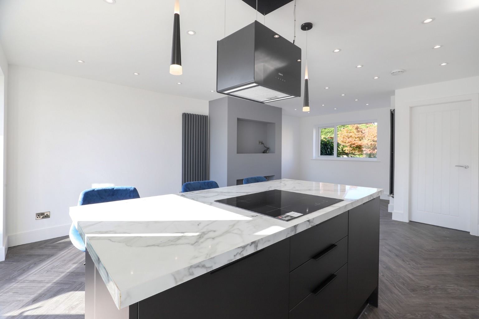 The high-spec kitchen is a chef's dream, meticulously designed with integrated appliances that blend seamlessly into the stylish cabinetry. A magnificent island takes centre stage, offering ample preparation space and a perfect spot for casual dining or socialising. Above, a striking floating extractor adds a touch of architectural flair. Additionally, a practical downstairs toilet adds to the convenience of this thoughtfully designed home.