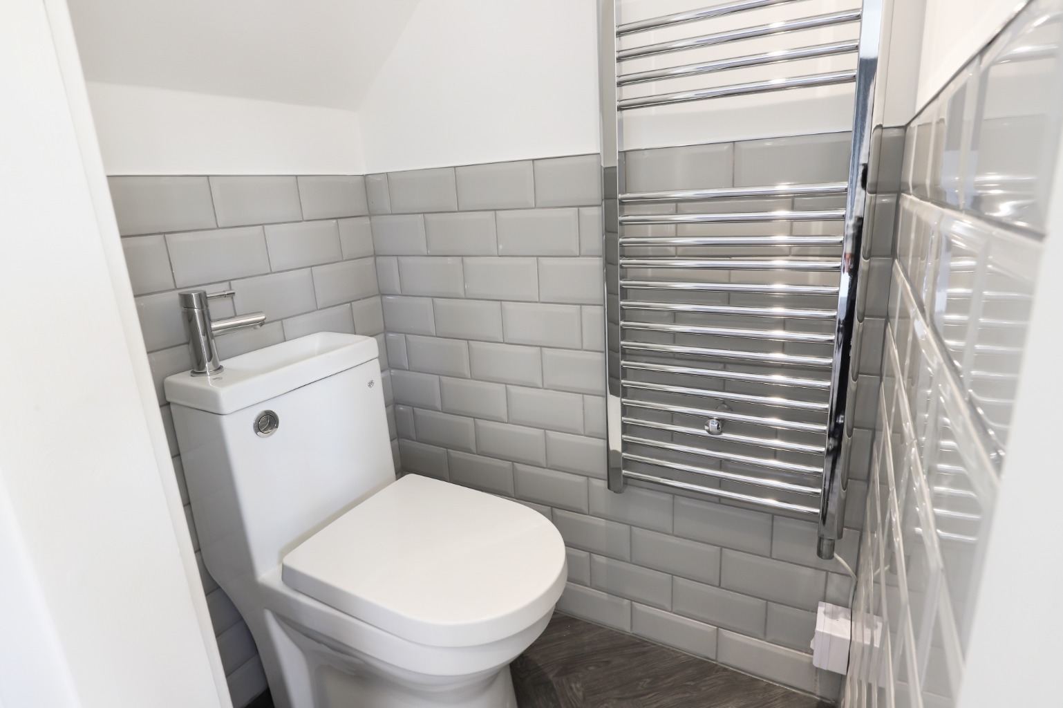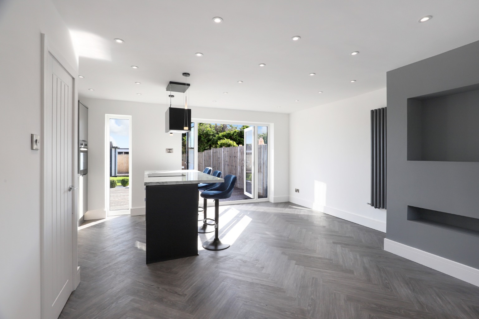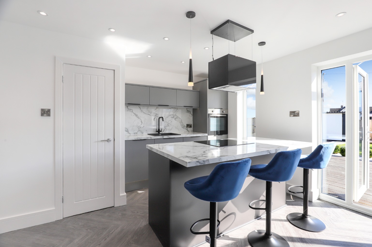 The high-spec kitchen is a chef's dream, meticulously designed with integrated appliances that blend seamlessly into the stylish cabinetry. A magnificent island takes centre stage, offering ample preparation space and a perfect spot for casual dining or socialising. Above, a striking floating extractor adds a touch of architectural flair. Additionally, a practical downstairs toilet adds to the convenience of this thoughtfully designed home.