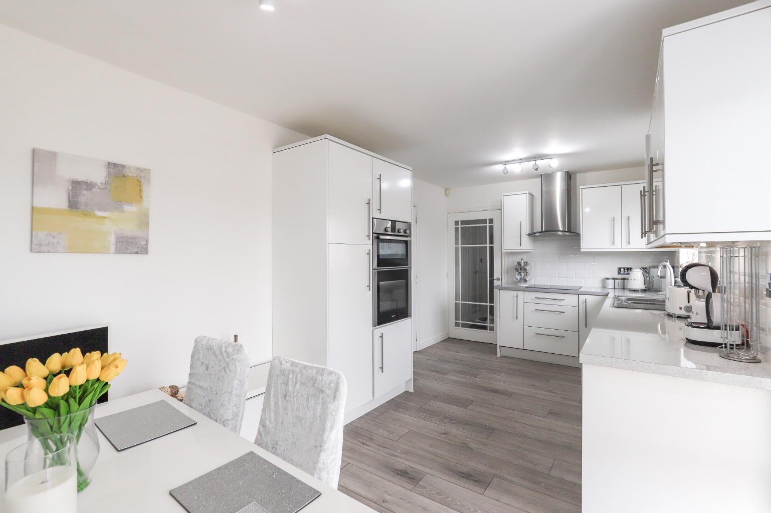 At the heart of the home, the sleek open-plan kitchen and dining area is designed for modern living. The high-gloss kitchen, finished in neutral tones, is both stylish and functional, offering ample storage and workspace. A utility room provides extra convenience, while doors from the dining area lead directly to the garden, seamlessly blending indoor and outdoor living. The conservatory, with direct garden access, is an ideal retreat for relaxation.