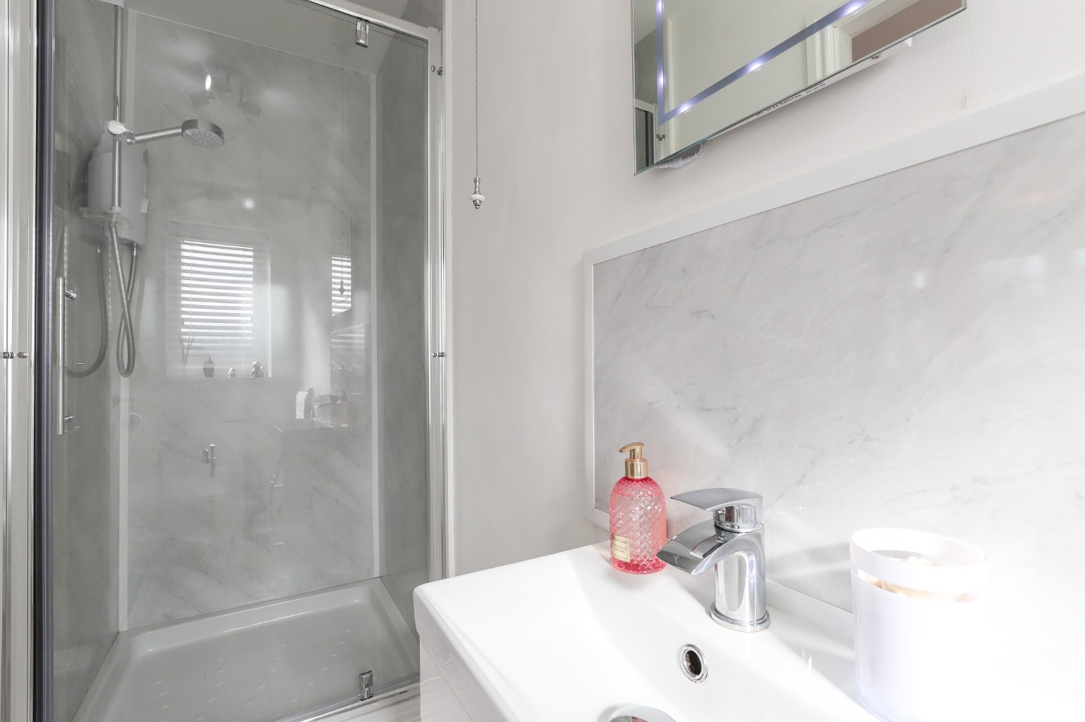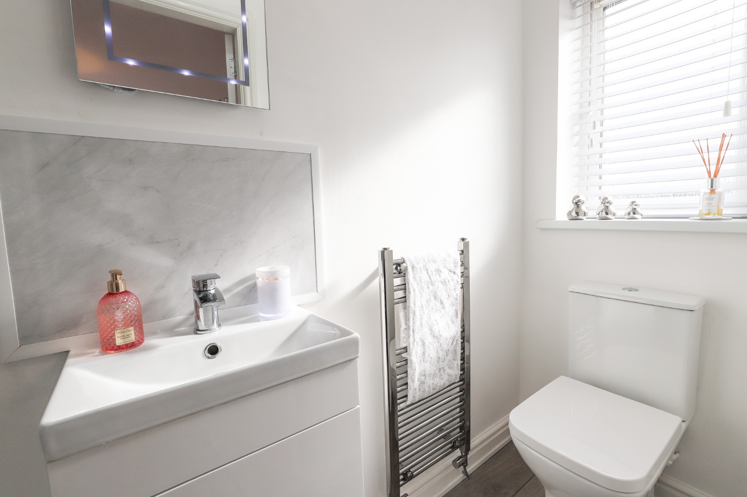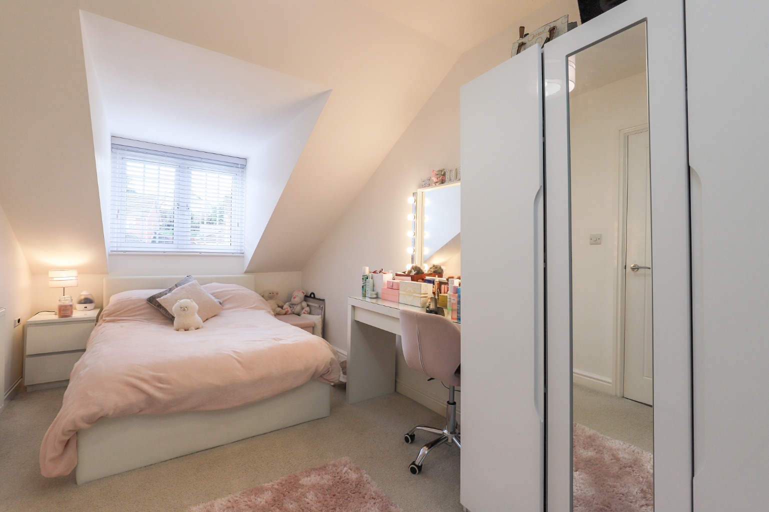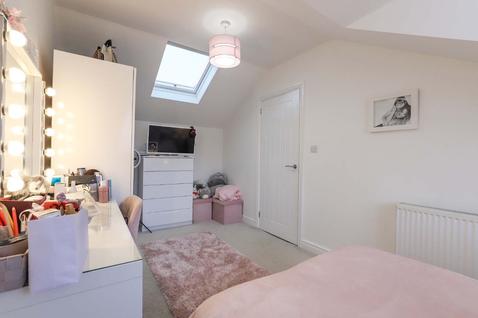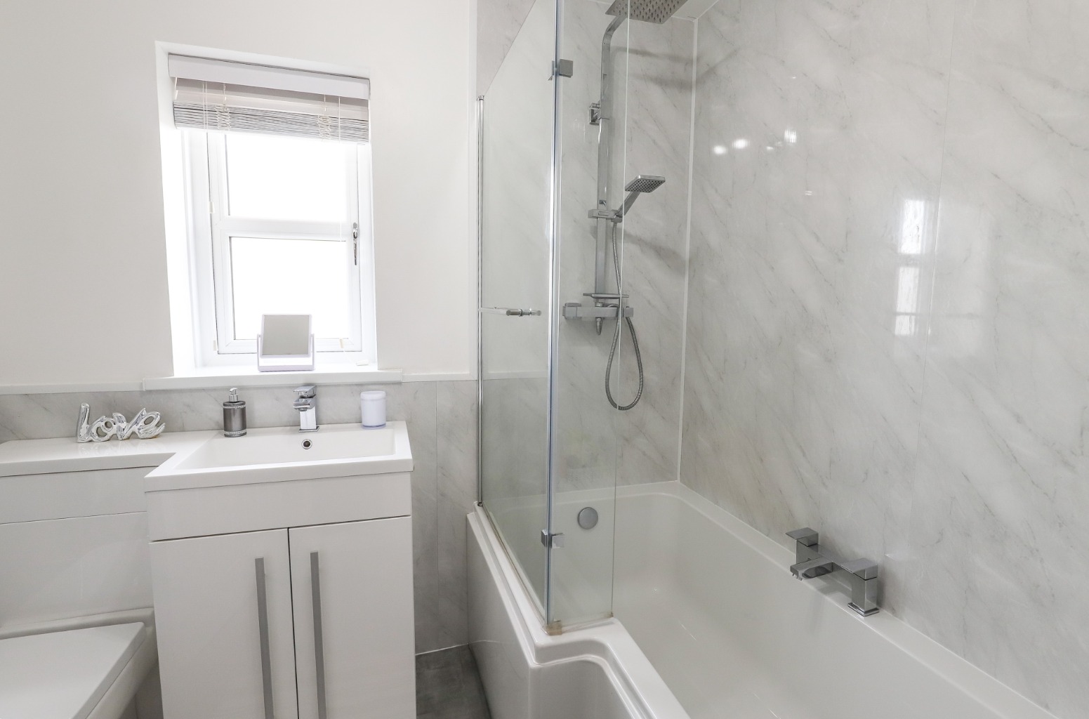Upstairs, the home offers four well-appointed bedrooms, all fully carpeted for warmth and comfort. The main bedroom is a spacious sanctuary, complete with an elegant en-suite bathroom. The second and third bedrooms are generous doubles, with the third featuring dual aspect skylight ceiling windows. The fourth bedroom is a spacious single, perfect as a child’s room, guest space, or home office. The family bathroom, featuring a P-shaped bath with an overhead shower and striking marble tiles, adds a touch of luxury.