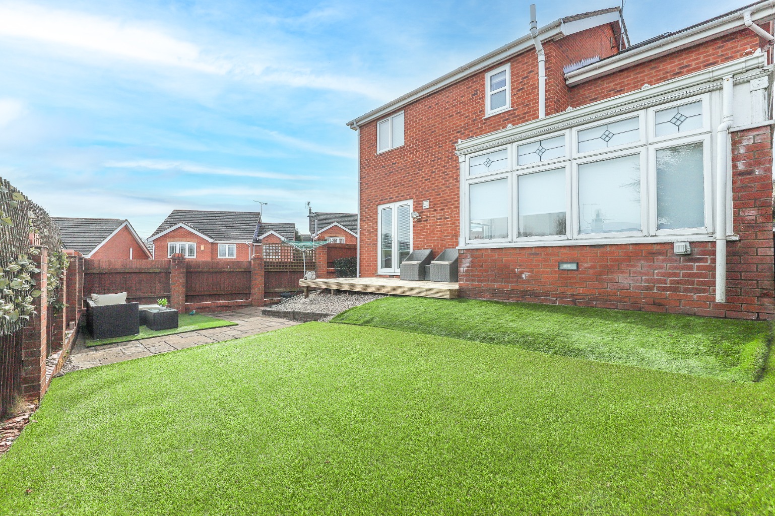 The exterior of the property is designed for easy maintenance, with a large rear garden featuring artificial lawn, paved sections, and a small decking area—perfect for entertaining or relaxing. The garage and large driveway provide ample parking for multiple vehicles.